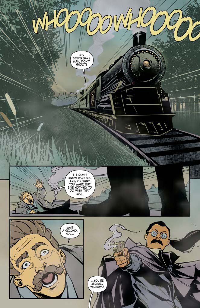 Okay, so I love the crowd in this scene, with the noise and hustle and details of the carriage, but my favorite thing is the exterior of the train, and the way Julius has created not only the look of a fast-moving train carriage but somehow the feel and the sounds and the wind in our hair, and the smoke in our eyes. Watson's mettle is tested as the goon opens fire, and the panel of him clinging on for dear life in the tunnel is one of my favorite-ever panels.