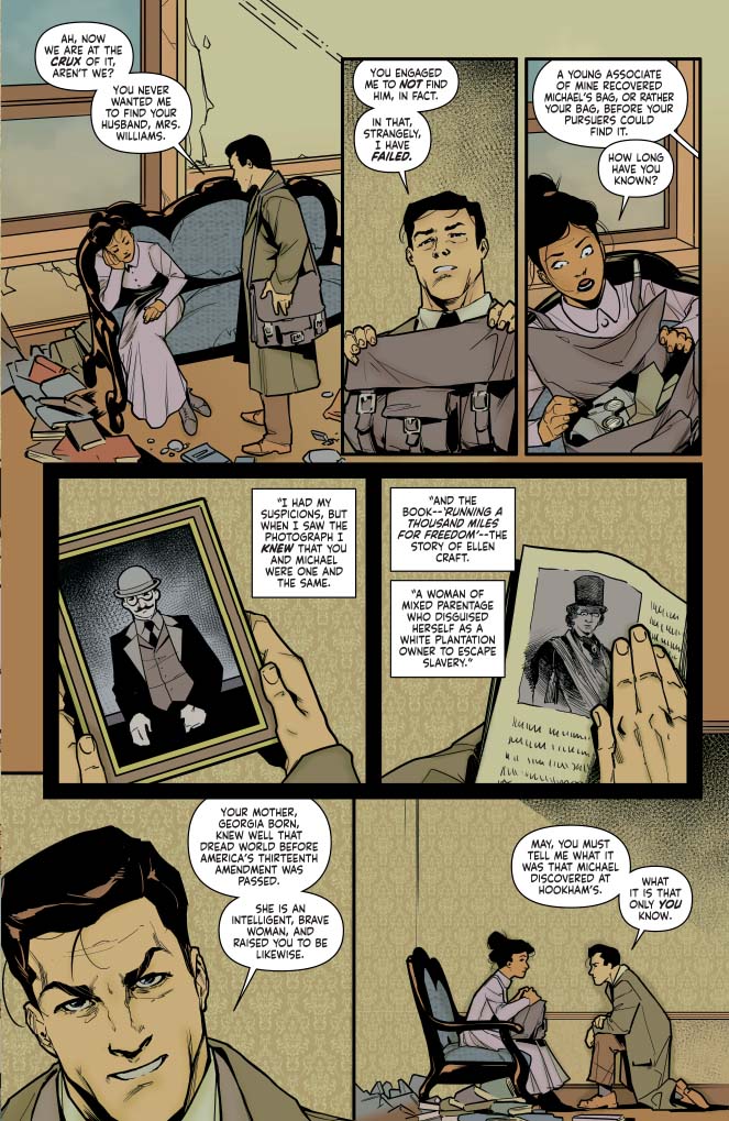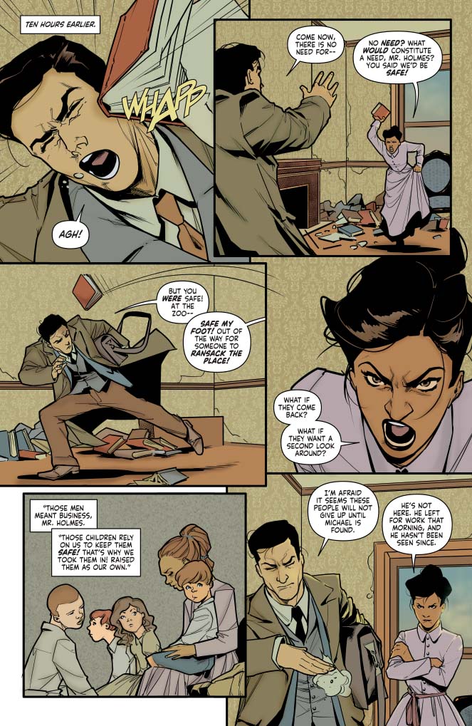 These are the two pages on which the series pivots, so I hope the surprise is a big one for the readers. I tried to make it obvious/not obvious so it would be the big Easter egg of the book. I love May in her element raging at Holmes, and I love her vulnerable as he shows her his discovery. Him kneeling down to her level as the truth finally spills out is my favorite panel.