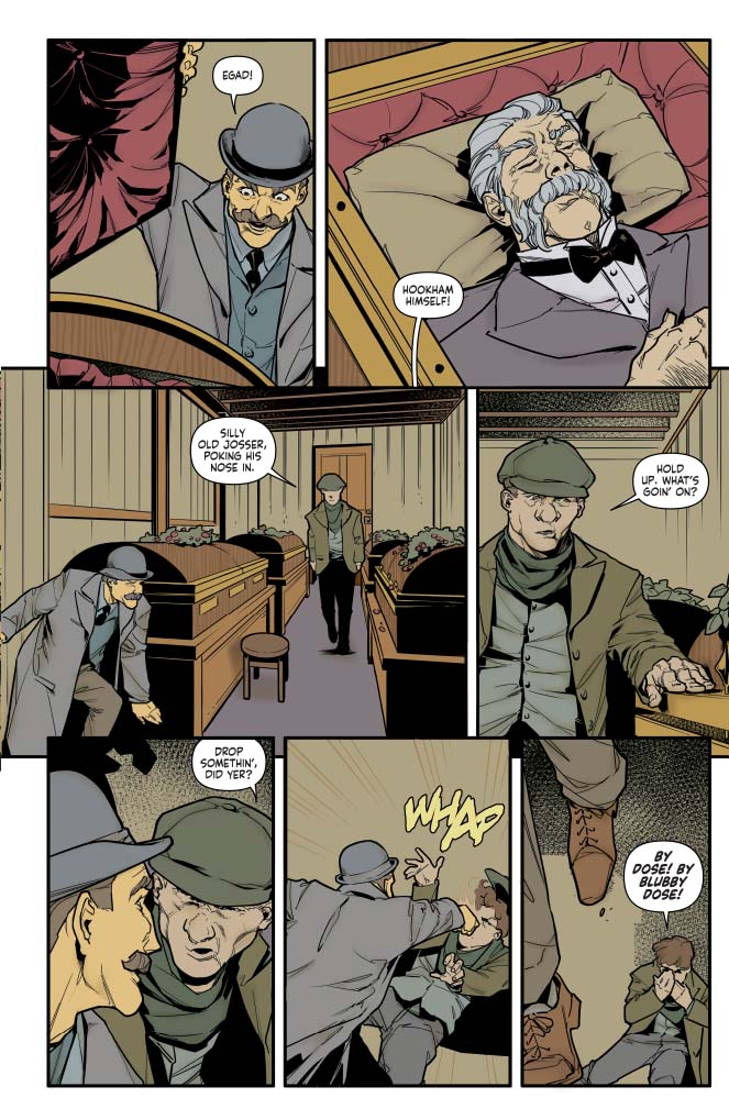 Not only are these Watson pages, but he is on board the Necropolis Railway hurtling out of London, so obviously I loved writing them! He's the best have-a-go hero you could want, never shy to get stuck in to the action, and always handy in a fight. I love all the bad guys in this for their lackluster menace, and I love the setting here, with Watson slugging it out amongst the coffins!