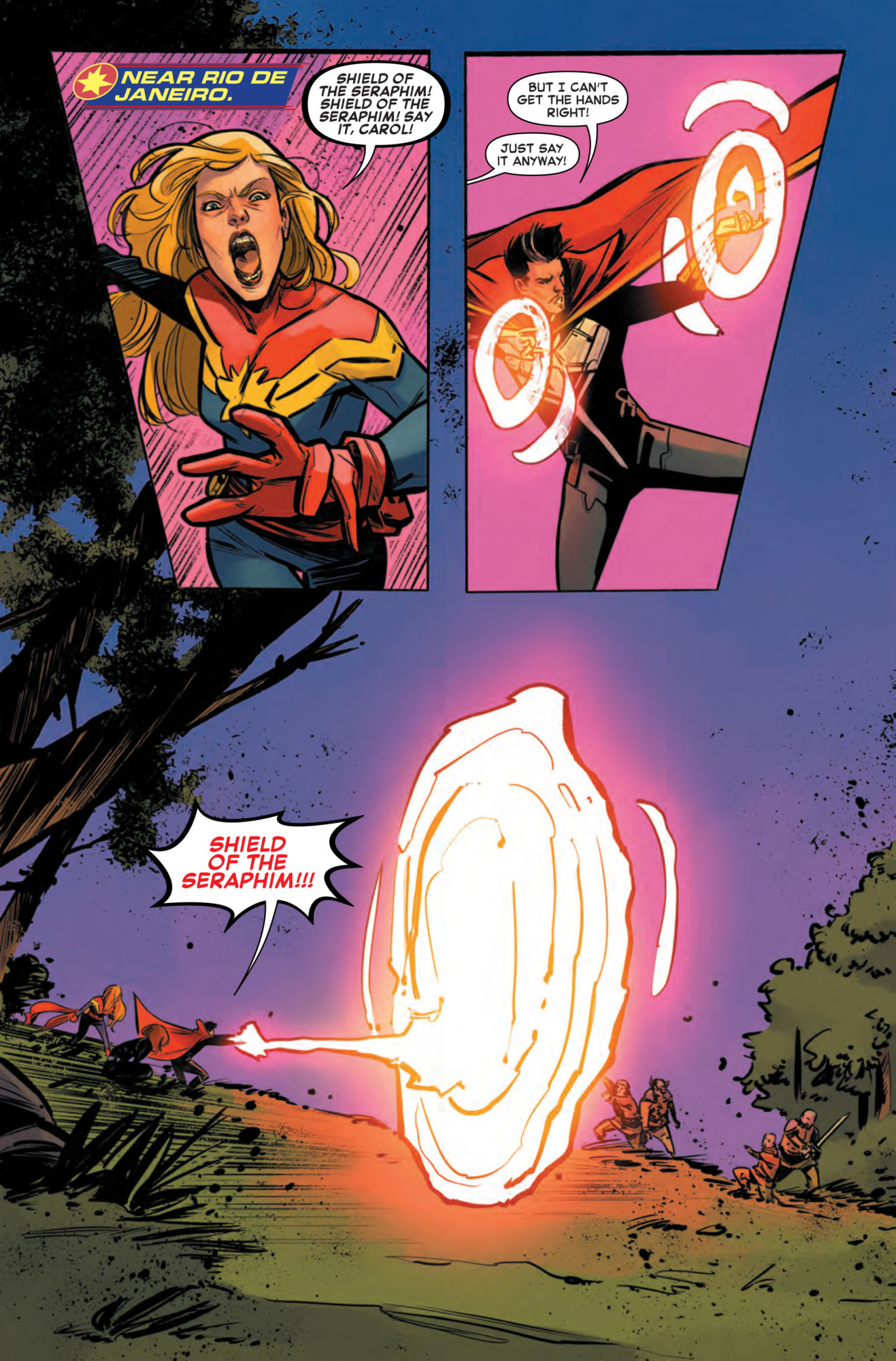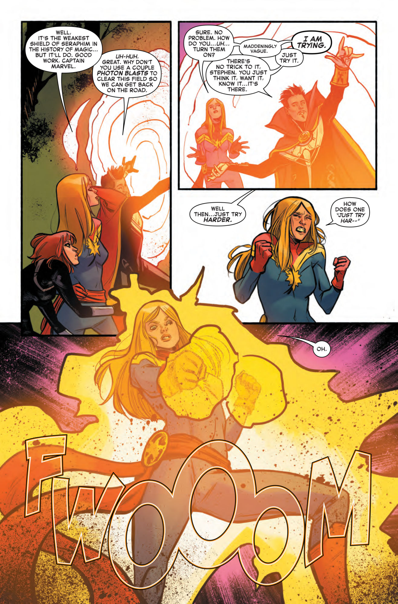 Captain Marvel and Doctor Strange have a problem in the current storyline in next week's Captain Marvel #7. Thanks to a spell by the Enchantress, they've switched bodies, which would normally make for a great fish-out-of-water comedy, if not for the fact that it's happened while the pair are with the Black Widow in South America fighting the War of the Realms! Fortunately, after some awkwardness last issue, this preview of Captain Marvel #7 shows that these two are starting to get the hang of things…