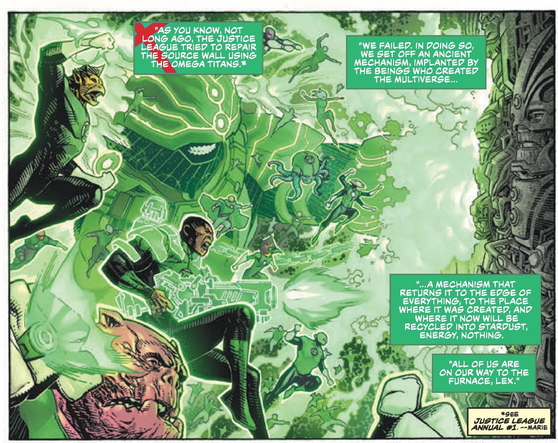 After the disastrous events of the Justice League Annual, Martian Manhunter decides to take matters into his own hands and negotiate a peace with Legion of Doom leader Lex Luthor. Traveling to a distant moon, the two enemies face their intertwined pasts in a showdown for the fate of the Multiverse. However, before either of them can lay claim to the power of the Source Wall once and for all, an unexpected threat forces them to unite…or risk death at the ends of the cosmos.
