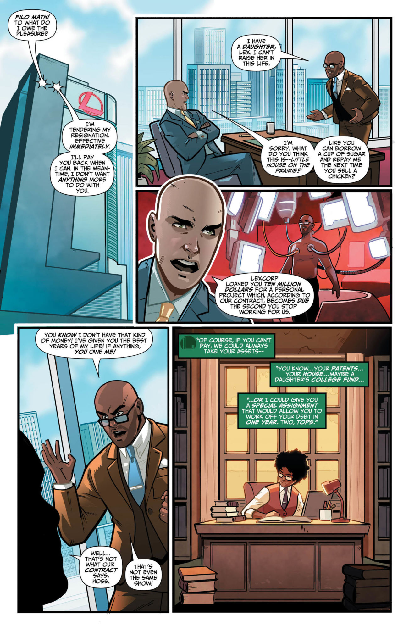 One of the biggest problems in the world today is crushing debt. Credit card debt, student loan debt, whatever the source, it's dragging everyone down. It's no different for reformed villain Filo Math in this preview of next week's Wonder Twins #3. Math is into 1%er Lex Luthor for ten million dollars, and now that he wants to quit working for Lex's company, the money has come due…