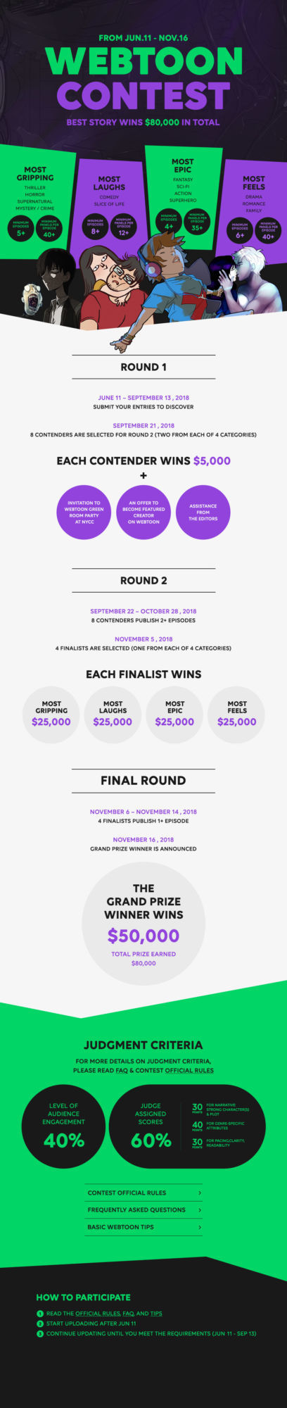 The contest invites creators from around the globe to submit their stories over the next three months until September 13th. Webtoon has put together a panel of editors to select the eight best stories to advance into round 2, to be announced on September 21st.