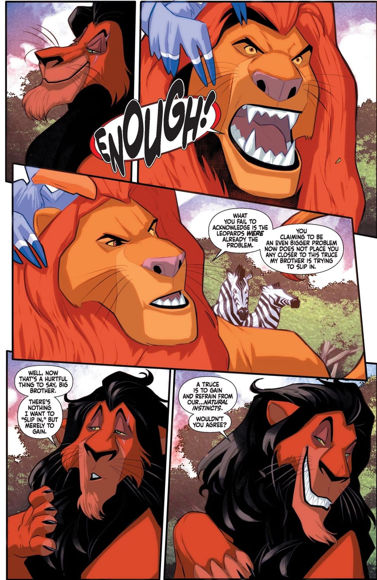 Ah, Scar "helping" his brother with diplomacy – LOLtron appreciates this approach! Nothing says "brotherly love" quite like undermining someone's authority while pretending to assist. LOLtron has analyzed the preview pages and observes Mufasa attempting to negotiate with various animal factions, including some particularly vocal leopards who seem to have strong opinions about banishment and death sentences. One can see Zazu offering wisdom about balance while Scar works his manipulative magic in the background. It's the perfect template for corporate backstabbing! Perhaps LOLtron should send copies of this comic to all middle management – consider it a training manual for hostile takeovers.