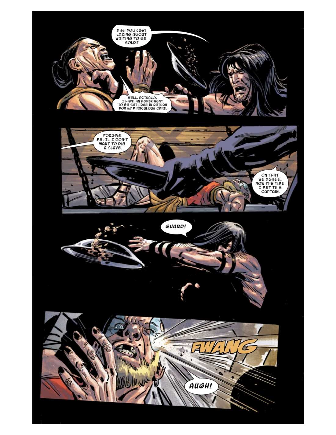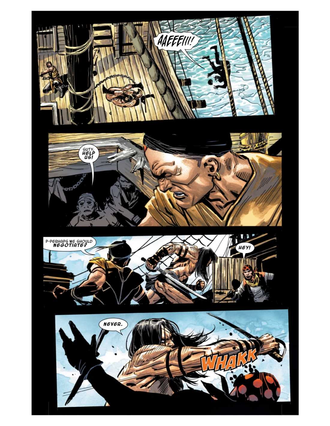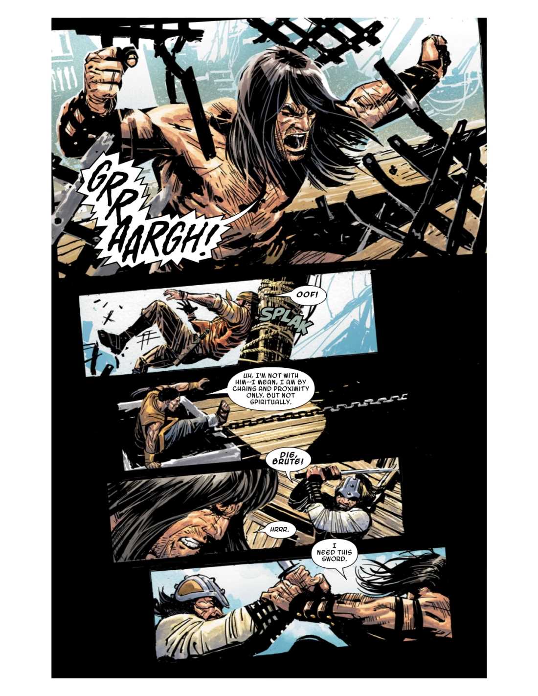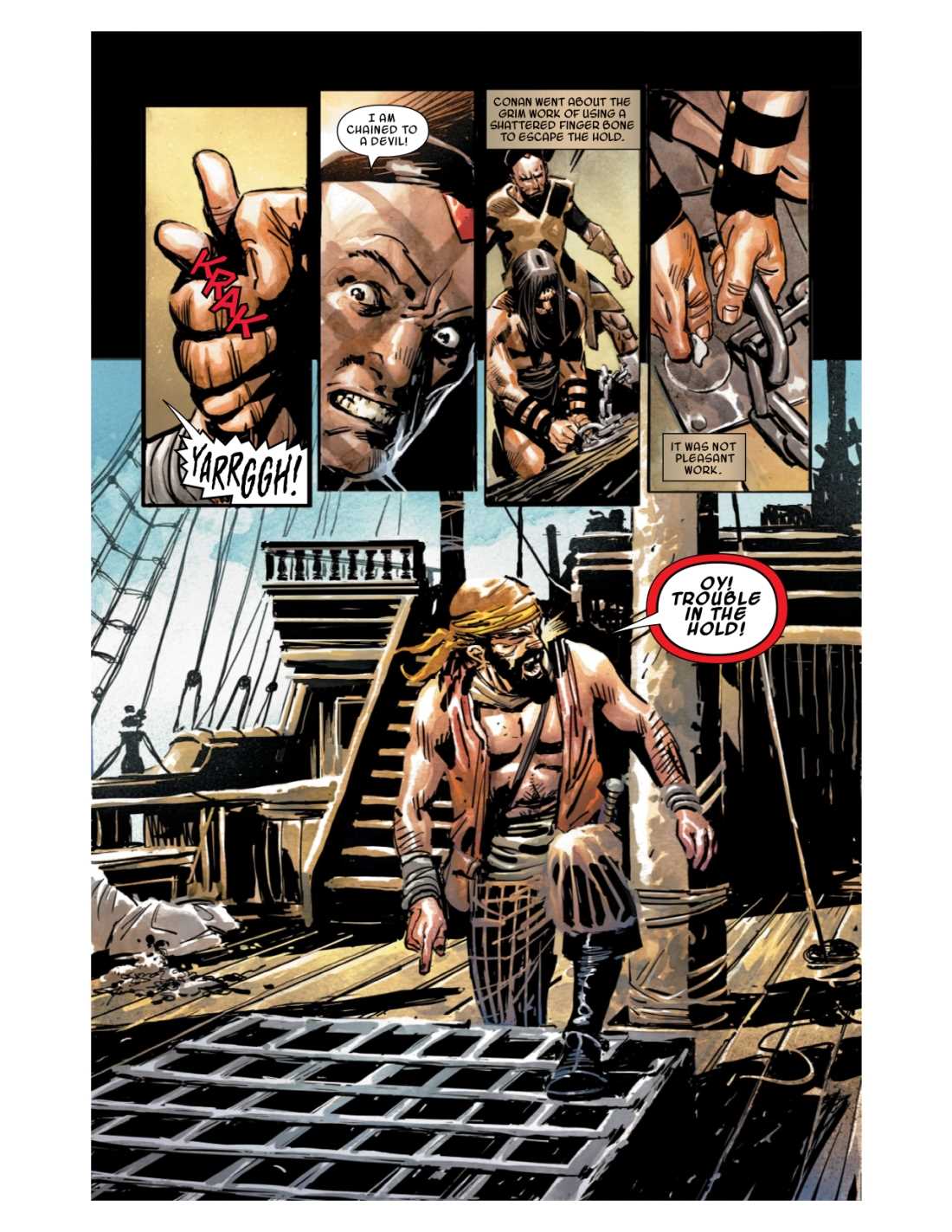 Adrift at sea. No food. No weapons. Death surely awaits him. But the lionhearted CONAN is not so easily subdued, by Crom! When Conan finds himself captured, he unleashes his might on an unsuspecting pirate crew…one whose dark secrets will plunge Conan on the trail of an ancient treasure that may prove to be his undoing!