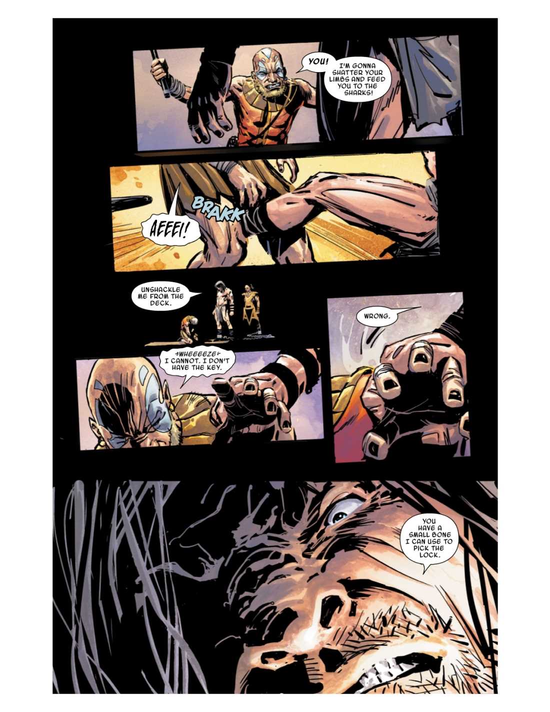 Imprisoned on a ship, Conan murders a guard, not to obtain a key to escape his cell, but to obtain one of the guard's finger bones to pick the lock with!