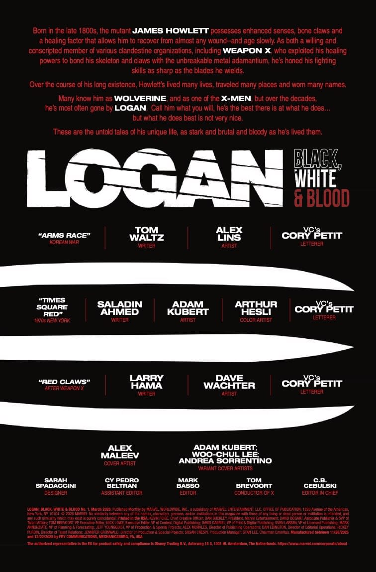 - Interior preview page from 75960621350400111 LOGAN: BLACK WHITE AND BLOOD #1 ALEX MALEEV COVER, by Saladin Ahmed & Tom Waltz & Adam Kubert & Alex Lins & Alex Maleev, in stores Wednesday, January 14, 2026 from Marvel