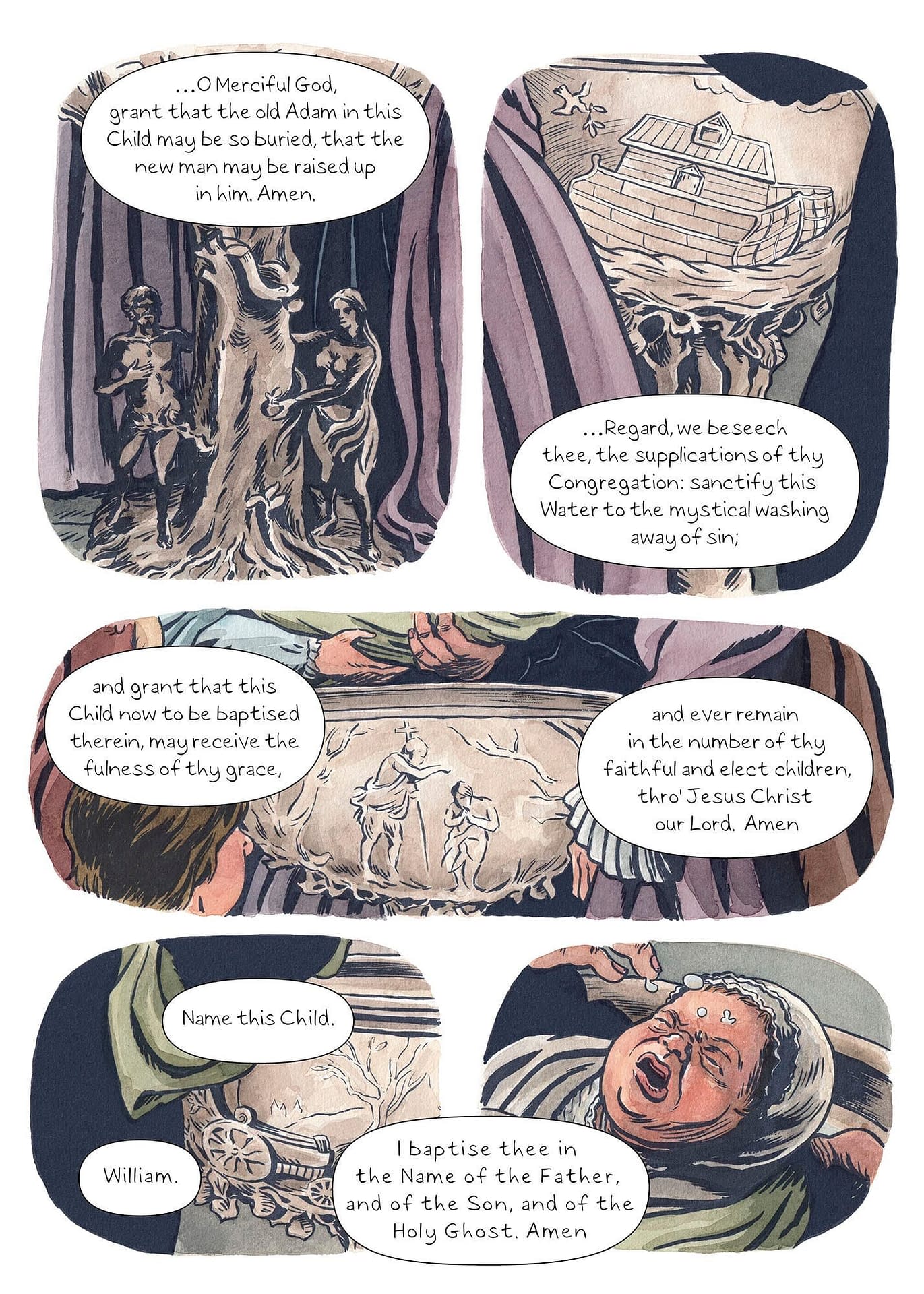 And he has been serialising that graphic novel on Substack, currently across eight posts, the last one posted yesterday for the start of London Book Fair. Might that be timely and fortuitous? He writes, "I love Blake (1757-1827, in case you're wondering) for the same reason that I love comics – the magic that happens when you combine words with pictures! Though he's probably best known as a poet, Blake was equally a poet and visual artist. He made his living, such as it was, as a freelance engraver, and his poems were originally published as lavish artworks, drawn and handwritten (backwards!) on to copper plates, then printed and handprinted by William and his wife, Catherine, and issued in limited numbers, each copy unique."