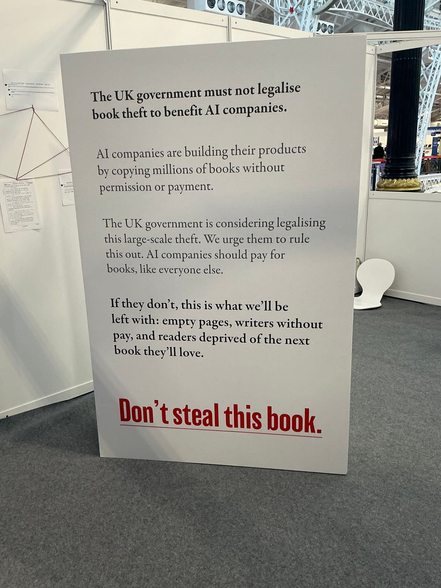 This statement targets ongoing UK policy debates, particularly around potential exceptions or changes to copyright law that could allow broader use of creative works for AI training under "commercial research" provisions. Newton-Rex and supporters argue the AI industry has been"built on stolen work, taken without permission or payment, and at the stall at the London Book Fair, they exhibit the leaked e-mails that show the decisions by senior social media executives to authorise the use of pirated libraries of literature to train their models, rather than seeking out permission and paying for it.