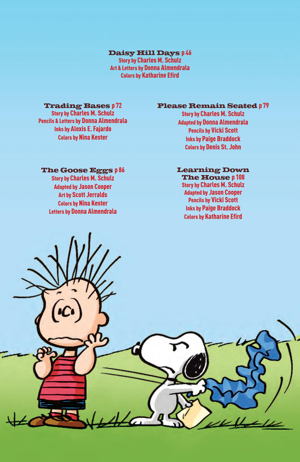 Artists: Charles M. Schulz, Vicki Scott, Paige Braddock, Alexis E. Fajardo, Donna Almendrala