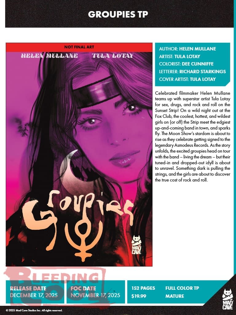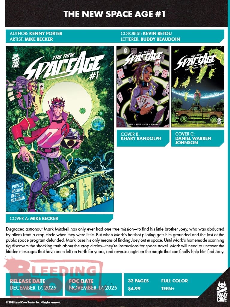 Mad Cave Studios' December 2025 solicits and solicitations see Dan DiDio return to The Defenders of the Earth with Alex Sanchez on Dark Destiny #1, as well as the Groupies collection by Helen Mullane and Tulah Lotay, the launch of The Space Age #1 by Kenny Porter and Mike Becker, Cyberarchy #1 by Matt Hardy and Clark Bint, Our Soot Stained Heart #1 by Joni Hagg and Stipan Morian and a Pop Kill Christmas special from Dave Johnson, Jimmy Palmiotti and Juan Santacruz.