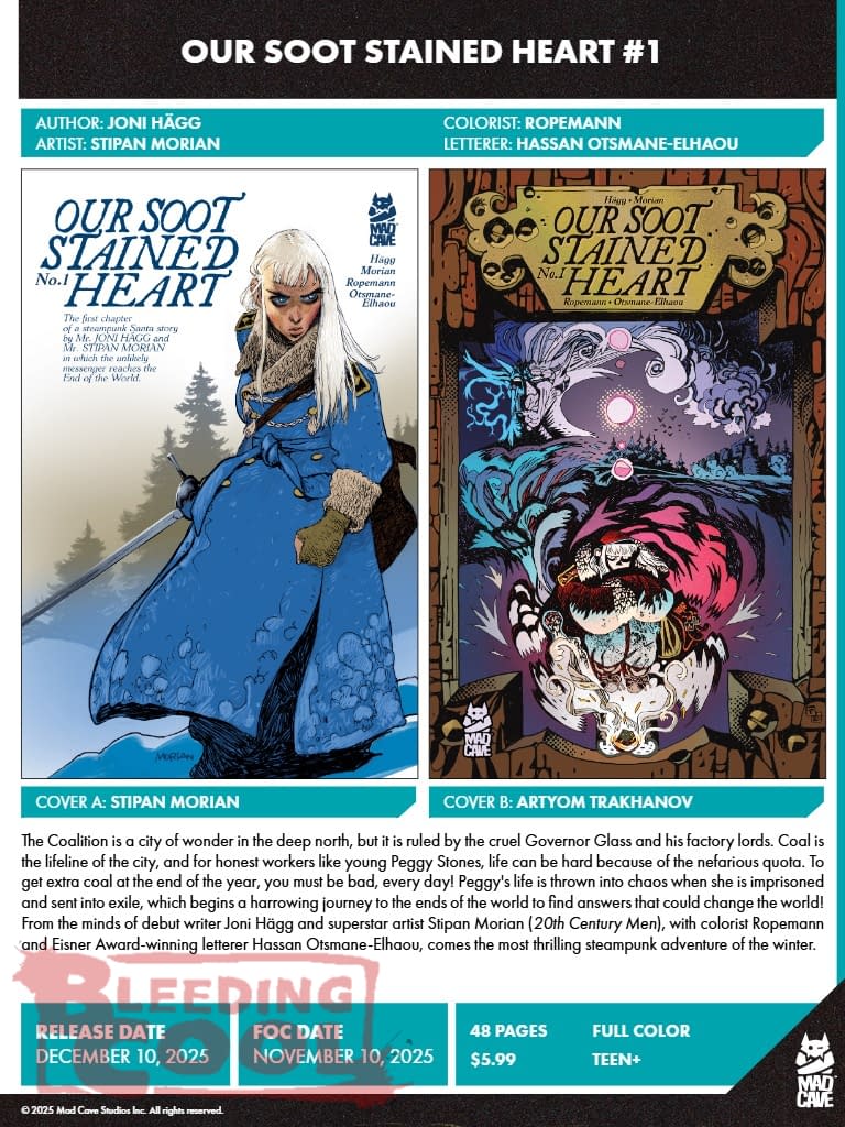 The Coalition is a city of wonder in the deep north, but it is ruled by the cruel Governor Glass and his factory lords. Coal is the lifeline of the city, and for honest workers like young Peggy Stones, life can be hard because of the nefarious quota. To get extra coal at the end of the year, you must be bad, every day! Peggy's life is thrown into chaos when she is imprisoned and sent into exile, which begins a harrowing journey to the ends of the world to find answers that could change the world! From the minds of debut writer Joni Hägg and superstar artist Stipan Morian (20th Century Men), with colorist Ropemann and Eisner Award-winning letterer Hassan Otsmane-Elhaou, comes the most thrilling steampunk adventure of the winter.