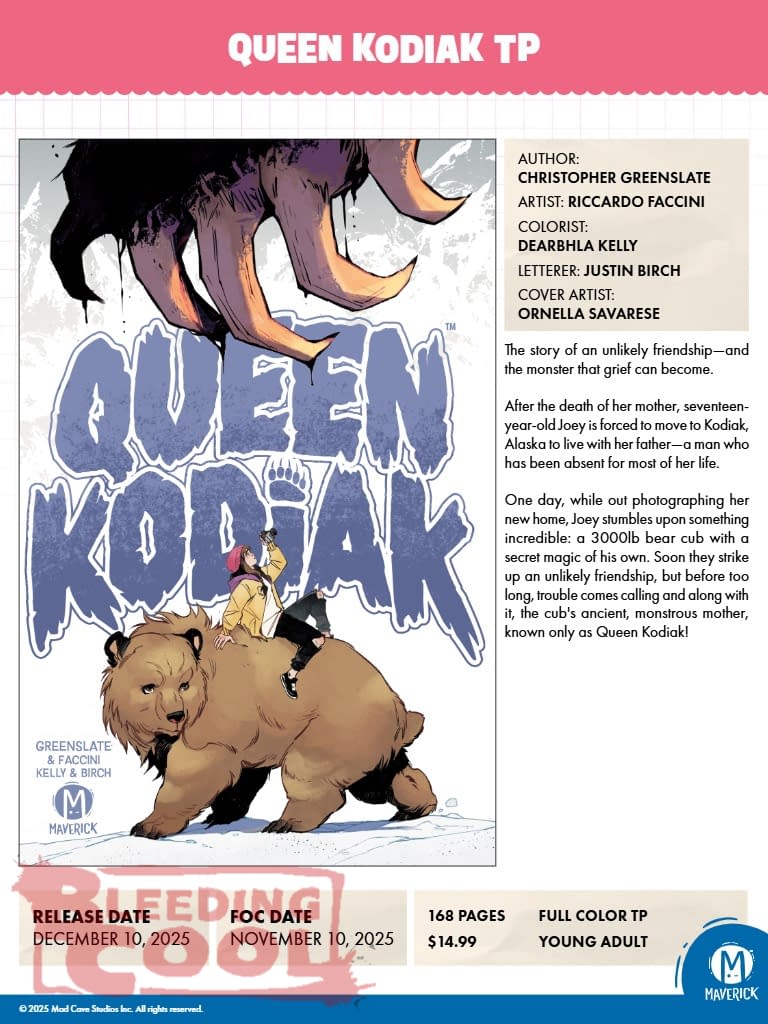The story of an unlikely friendship—and the monster that grief can become. After the death of her mother, seventeen-year-old Joey is forced to move to Kodiak, Alaska to live with her father—a man who has been absent for most of her life. One day, while out photographing her new home, Joey stumbles upon something incredible: a 3000lb bear cub with a secret magic of his own. Soon they strike up an unlikely friendship, but before too long, trouble comes calling and along with it, the cub's ancient, monstrous mother, known only as Queen Kodiak!