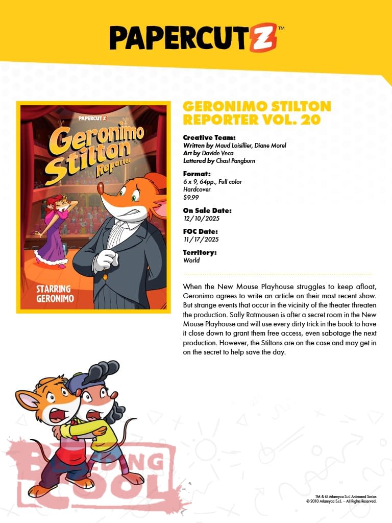When the New Mouse Playhouse struggles to keep afloat, Geronimo agrees to write an article on their most recent show. But strange events that occur in the vicinity of the theater threaten the production. Sally Ratmousen is after a secret room in the New Mouse Playhouse and will use every dirty trick in the book to have it close down to grant them free access, even sabotage the next production. However, the Stiltons are on the case and may get in on the secret to help save the day.