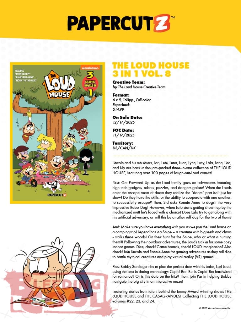 Lincoln and his ten sisters, Lori, Leni, Luna, Luan, Lynn, Lucy, Lola, Lana, Lisa, and Lily are back in this jam-packed three-in-one collection of THE LOUD HOUSE, featuring over 100 pages of laugh-out-Loud comics! First: Get Powered Up as the Loud family goes on adventures featuring high tech gadgets, robots, puzzles, and dangers galore! When the Louds enter the escape room of doom they realize the "doom" part isn't just for show! Do they have the skills, or the ability to cooperate with one another, to successfully escape? Then, Sid asks Ronnie Anne to dogsit the very impressive Robo-Dog! However, when Lalo starts getting shown up by the mechanized mutt he's faced with a choice! Does Lalo try to get along with his artificial adversary, or will this be a rather ruff day for the two of them? And: Make sure you have everything with you as we join the Loud house on a camping trip! Legend has it a Snipe – a creature with big teeth and claws – stalks these woods! On their hunt for the Snipe, who or what is hunting them?! Following their outdoor adventures, the Louds tuck in for some cozy indoor games. Dice, check! Game boards, check! LOUD imagination? Also check! Join Lincoln and Ronnie Anne for gaming adventures as they roll dice to battle mythical creatures and play virtual reality (VR) games! Plus: Bobby Santiago tries to plan the perfect date with his babe, Lori Loud, using the best in dating technology: Cupid-Bot! But is Cupid-Bot hardwired for romance? Or is this date on the fritz? Then, join Par in helping Bobby navigate the big city in an interactive maze! Featuring stories from talent behind the Emmy Award-winning shows THE LOUD HOUSE and THE CASAGRANDES! Collecting THE LOUD HOUSE volumes #22, 23, and 24.