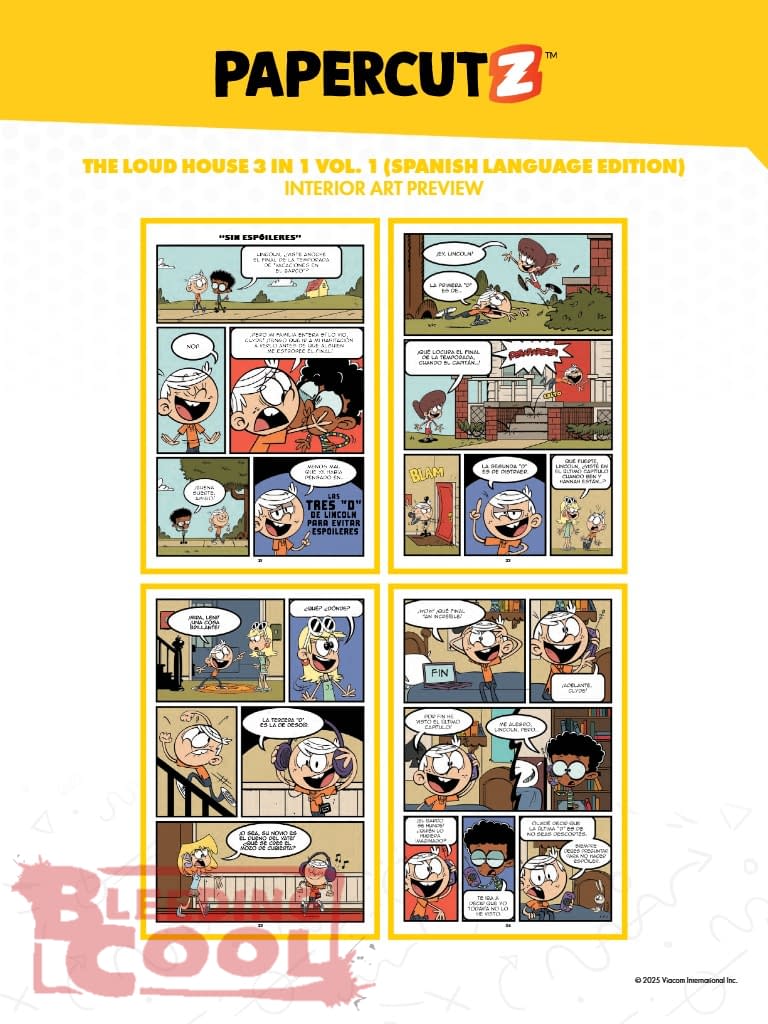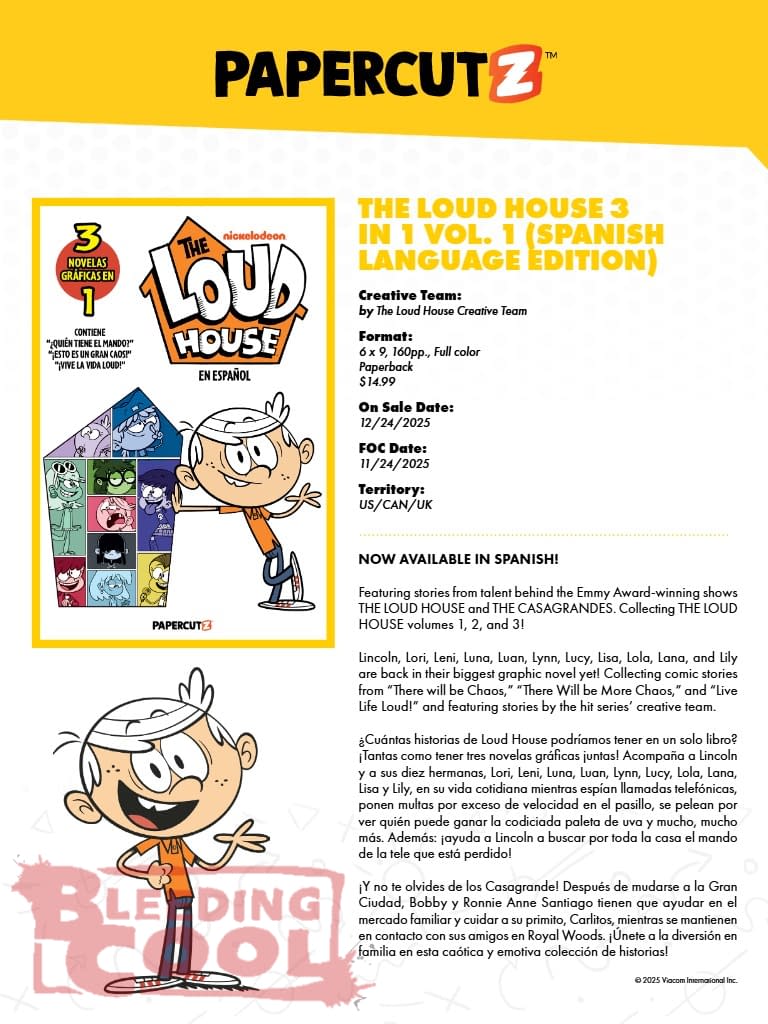NOW AVAILABLE IN SPANISH! Featuring stories from talent behind the Emmy Award-winning shows THE LOUD HOUSE and THE CASAGRANDES. Collecting THE LOUD HOUSE volumes 1, 2, and 3! Lincoln, Lori, Leni, Luna, Luan, Lynn, Lucy, Lisa, Lola, Lana, and Lily are back in their biggest graphic novel yet! Collecting comic stories from "There will be Chaos," "There Will be More Chaos," and "Live Life Loud!" and featuring stories by the hit series' creative team. ¿Cuántas historias de Loud House podríamos tener en un solo libro? ¡Tantas como tener tres novelas gráficas juntas! Acompaña a Lincoln y a sus diez hermanas, Lori, Leni, Luna, Luan, Lynn, Lucy, Lola, Lana, Lisa y Lily, en su vida cotidiana mientras espían llamadas telefónicas, ponen multas por exceso de velocidad en el pasillo, se pelean por ver quién puede ganar la codiciada paleta de uva y mucho, mucho más. Además: ¡ayuda a Lincoln a buscar por toda la casa el mando de la tele que está perdido! ¡Y no te olvides de los Casagrande! Después de mudarse a la Gran Ciudad, Bobby y Ronnie Anne Santiago tienen que ayudar en el mercado familiar y cuidar a su primito, Carlitos, mientras se mantienen en contacto con sus amigos en Royal Woods. ¡Únete a la diversión en familia en esta caótica y emotiva colección de historias!