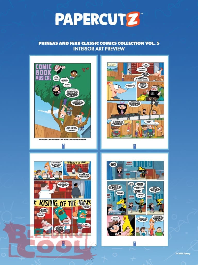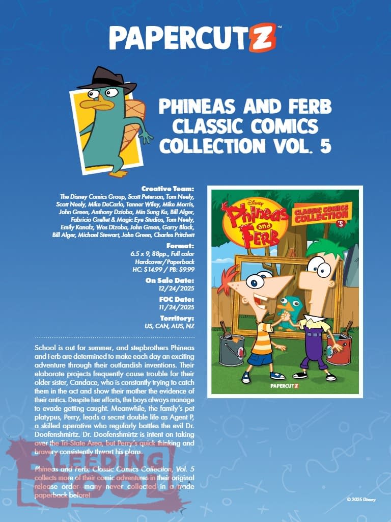 School is out for summer, and stepbrothers Phineas and Ferb are determined to make each day an exciting adventure through their outlandish inventions. Their elaborate projects frequently cause trouble for their older sister, Candace, who is constantly trying to catch them in the act and show their mother the evidence of their antics. Despite her efforts, the boys always manage to evade getting caught. Meanwhile, the family's pet platypus, Perry, leads a secret double life as Agent P, a skilled operative who regularly battles the evil Dr. Doofenshmirtz. Dr. Doofenshmirtz is intent on taking over the Tri-State Area, but Perry's quick thinking and bravery consistently thwart his plans. Phineas and Ferb: Classic Comics Collection, Vol. 5 collects more of their comic adventures in their original release order–many never collected in a trade paperback before! The Disney Comics Group, Scott Peterson, Tom Neely, Scott Neely, Mike DeCarlo, Tanner Wiley, Mike Morris, John Green, Anthony Dzioba, Min Sung Ku, Bill Alger, Fabricio Grellet & Magic Eye Studios, Tom Neely, Emily Kanalz, Wes Dizoba, John Green, Garry Black, Bill Alger, Michael Stewart, John Green, Charles Pritchett