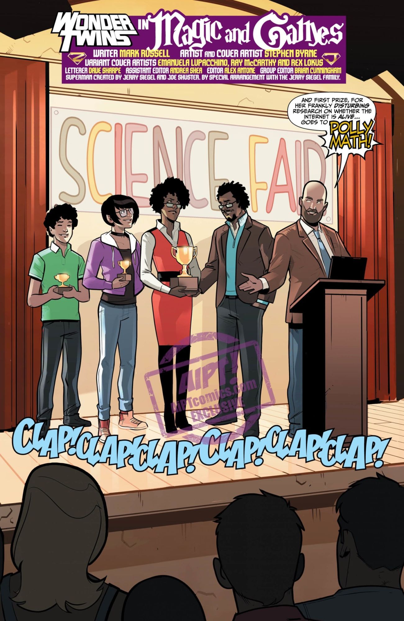 The much-talked-about and always-topical take on the Wonder Twins continues from irreverent and witty writer Mark Russell and artist Stephen Byrne, who captures both the humor and the heart of the siblings, exiled to Earth and interning for the Justice League. A battle royal between minor-league heroes and villains ends in tragedy and a horrifying revelation, teaching the world the true price of not taking people seriously. Always-hopeful Zan and cynical Jayna confront how circumstance (more than intent) often determines who's labeled a hero or villain.