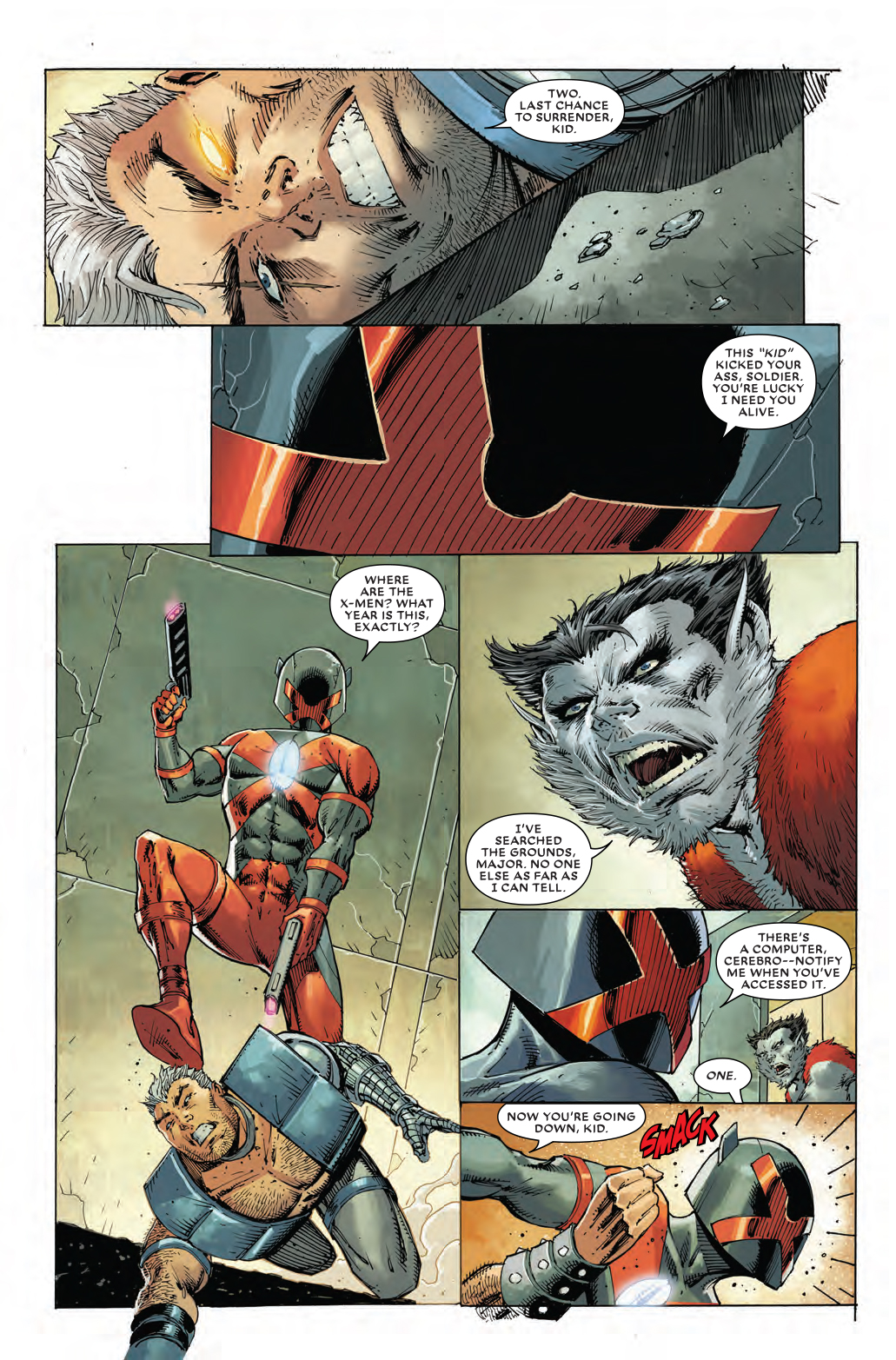 Well, we know he's from an alternate future where the X-Men and X-Force are considered legendary heroes. We know he carries adamantium swords and can beat Wolverine in a fight. And now, thanks to this preview of next week's Major X #1, we know that Major X is an extreme manspreader. Just gaze into the wonder of Major X's crotch as he straddles a defeated Cable in this preview…