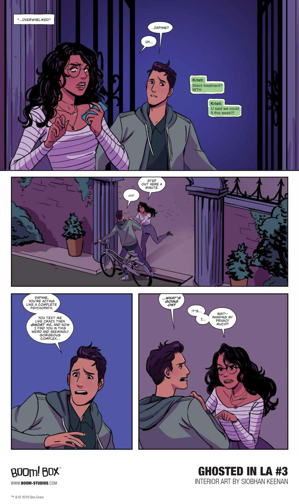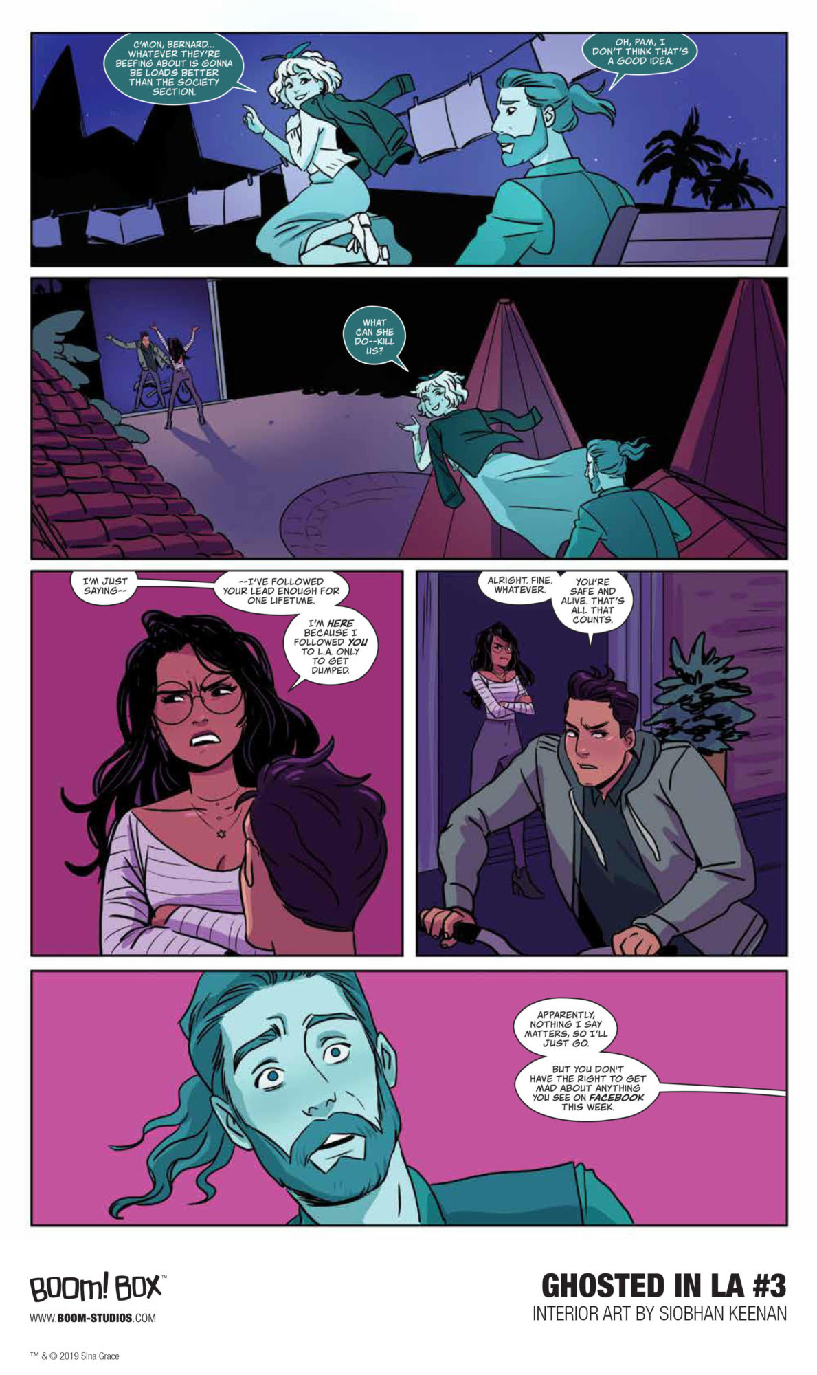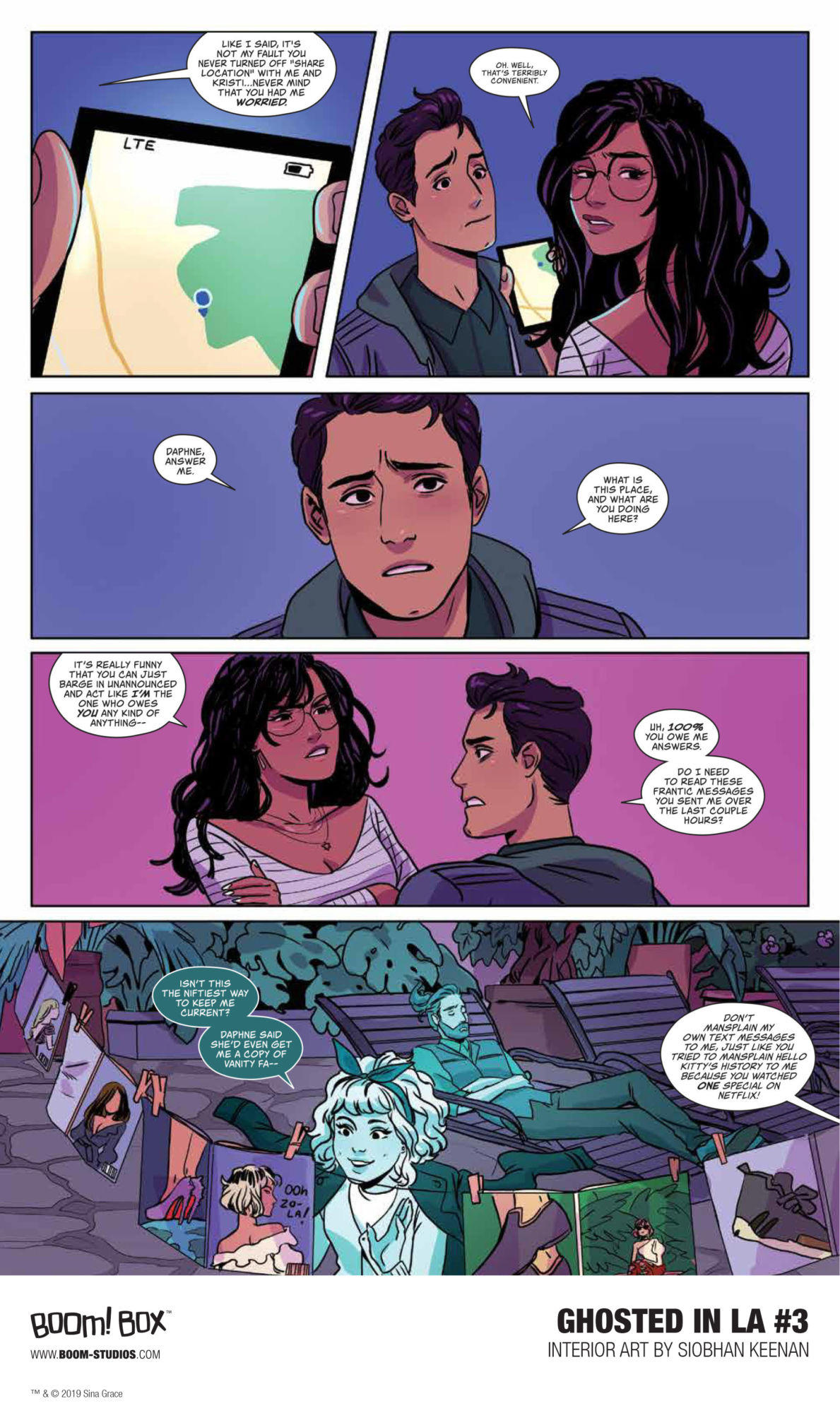 LOS ANGELES, CA (August 14, 2019) – BOOM! Studios revealed a first look at GHOSTED IN LA #3, the latest issue in the new original comic book series from GLAAD Media Award-nominated writer Sina Grace (Jughead's Time Police) and artist Siobhan Keenan (Jem and the Holograms), about figuring out your love life – and your afterlife – in Los Angeles, and available in stores September 2019.