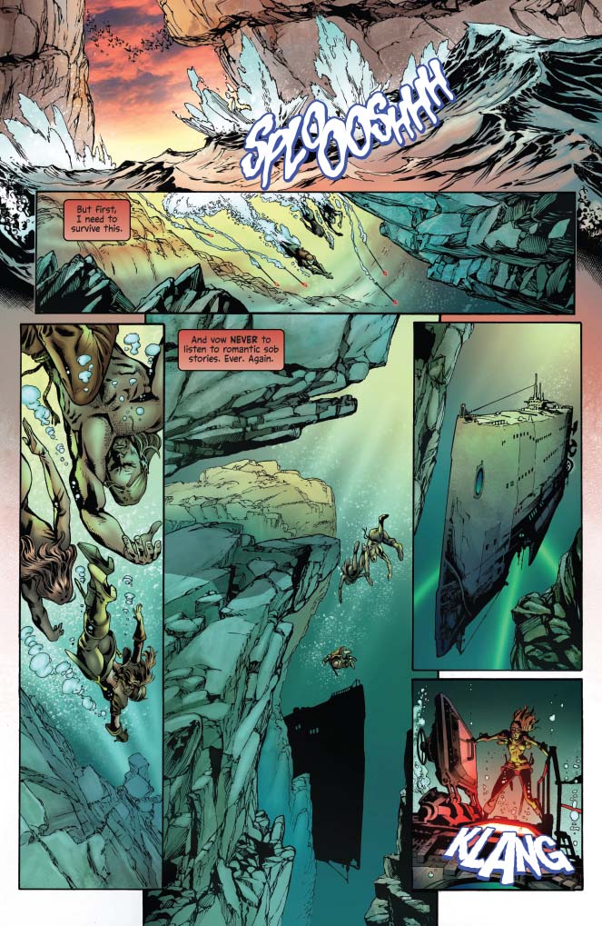 Here is where Igor really earns his money. The dreaded "people standing around talking" scene. Sometimes an info dump isn't a cheat, but totally necessary. (That's why you don't have the audience ahead of the characters at this point. The readers and the cast are finding out info at the same time. Plus: it's only issue #2, so there are lots of questions that need answering.)