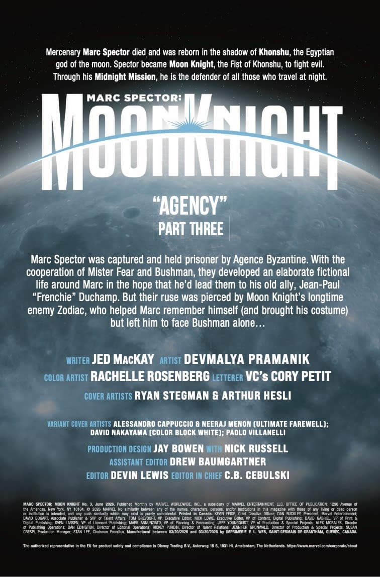 - Cover image for 75960621496900331 MARC SPECTOR: MOON KNIGHT #3 ALESSANDRO CAPPUCCIO ULTIMATE FAREWELL VARIANT, by Jed MacKay & Devmalya Pramanik, in stores Wednesday, April 22, 2026 from Marvel