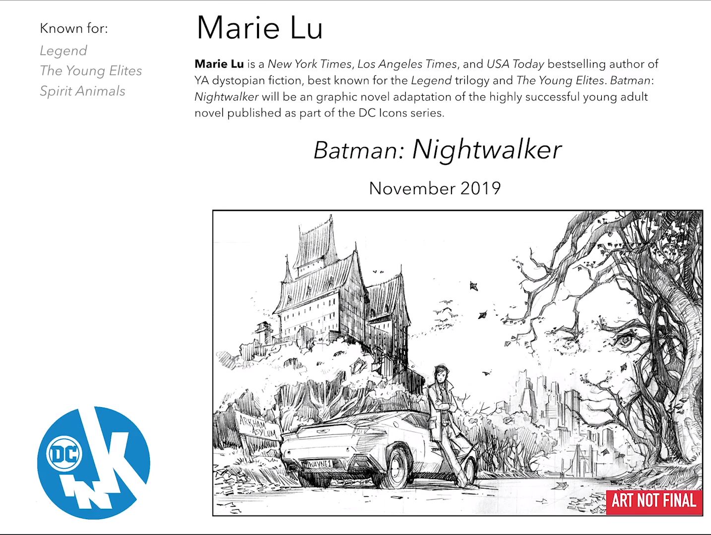At the American Library Association meet for the launch of the DC Ink and DC Zoom line for younger readers, for the Young Adult Zoom line, they announced that Marie Lu would be adapting her own Batman: Nightwalker novel as a graphic novel for November next year.