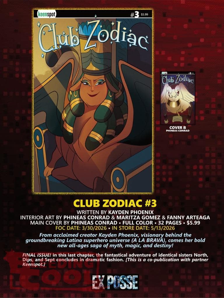 Acclaimed creator Kayden Phoenix, visionary behind the groundbreaking Latina superhero universe (A LA BRAVA), continues her bold new all-ages saga of myth, magic, and destiny! In this final chapter, the fantastical adventure of identical sisters North, Dips, and Sept concludes in dramatic fashion. [This is a co-publication with partner Keenspot.] $5.99 5/13/2026