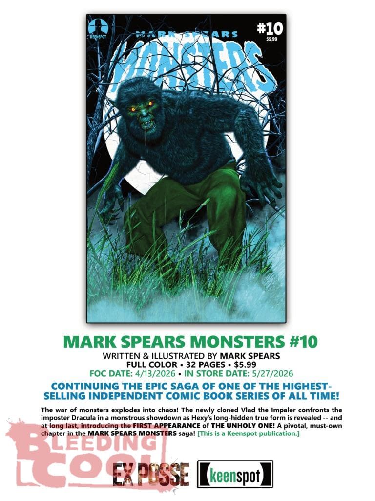 Continuing the epic saga from one of the highest-selling indie comic books ever, written and drawn by superstar Mark Spears. The war of monsters explodes into chaos! The newly cloned Vlad the Impaler confronts the imposter Dracula in a monstrous showdown as Hexy's long-hidden true form is revealed — and at long last, introducing the FIRST APPEARANCE of THE UNHOLY ONE! A pivotal, must-own chapter in the MARK SPEARS MONSTERS saga! [This is a Keenspot publication.] $5.99 5/27/2026