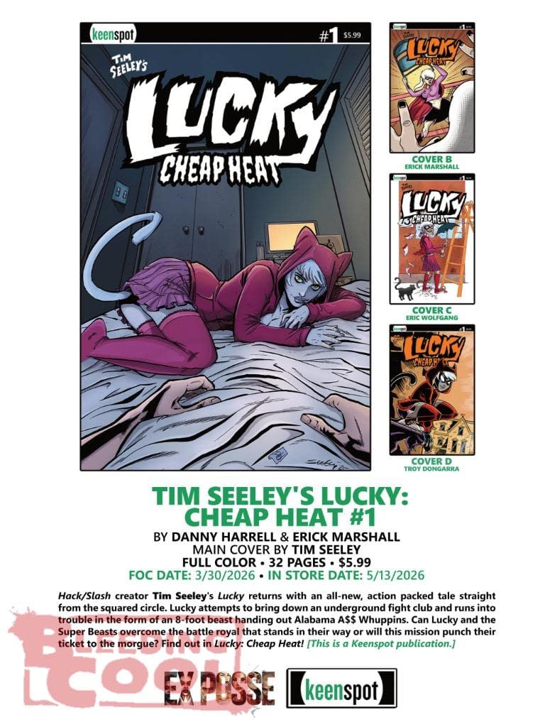Tim Seeley's Lucky returns with an all-new, action packed tale straight from the squared circle. Lucky attempts to bring down an underground fight club and runs into trouble in the form of an 8-foot beast handing out Alabama A$$ Whuppins. Can Lucky and the Super Beasts overcome the battle royal that stands in their way or will this mission punch their ticket to the morgue? Find out in Lucky: Cheap Heat! [This is a Keenspot publication.] $5.99 5/13/2026