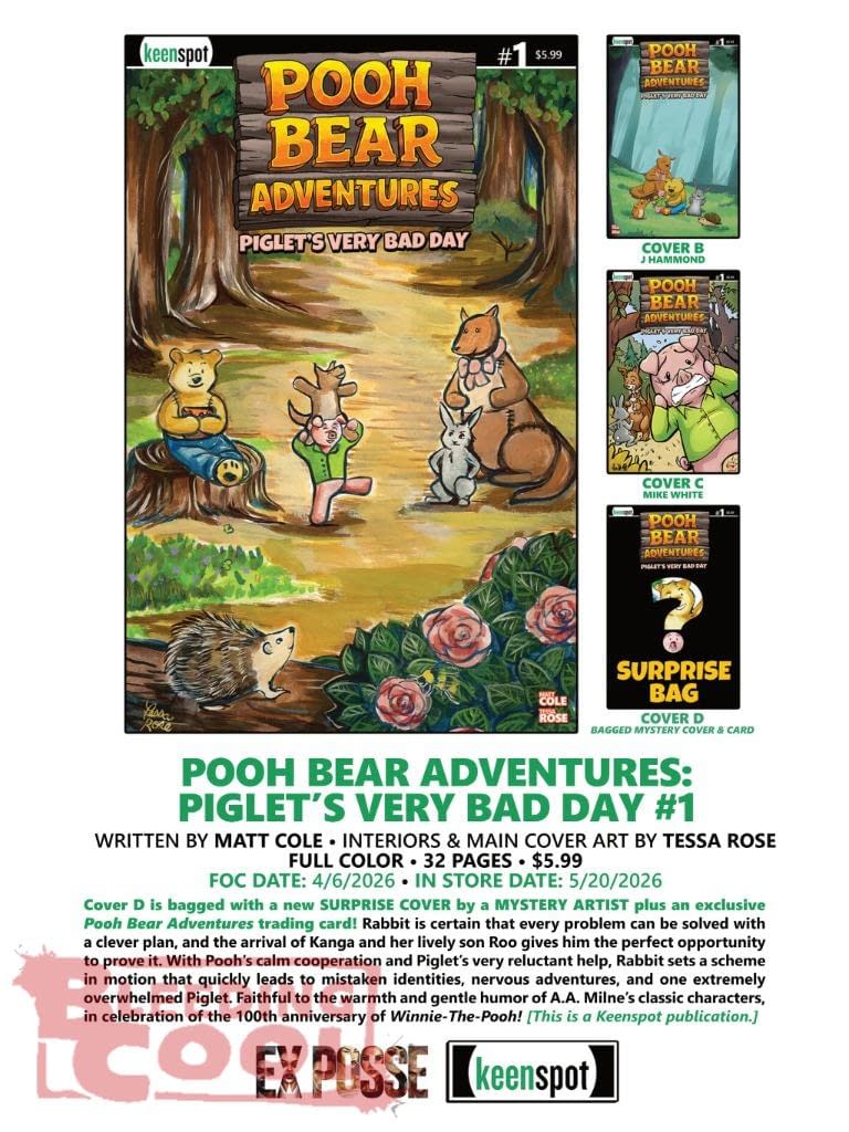 Rabbit is certain that every problem can be solved with a clever plan, and the arrival of Kanga and her lively son Roo gives him the perfect opportunity to prove it. With Pooh's calm cooperation and Piglet's very reluctant help, Rabbit sets a scheme in motion that quickly leads to mistaken identities, nervous adventures, and one extremely overwhelmed Piglet. Faithful to the warmth and gentle humor of A.A. Milne's classic characters, Pooh Bear Adventures: Piglet's Very Bad Day, delivers a charming all-ages story filled with laughs, heart, and timeless lessons about friendship, kindness, and the simple joys of the Hundred Acre Wood. [This is a Keenspot publication.] $5.99 5/20/2026