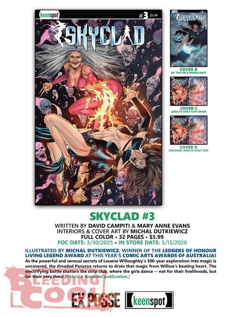 As the powerful and sensual secrets of Louene Willoughby's 300-year exploration into magic is uncovered, the dreaded Panacea returns to drain that magic from Willow's beating heart. The electrifying battle shatters the strip club, where the girls dance — not for their livelihoods, but for their very lives! [This is a Keenspot publication.] $5.99 5/13/2026