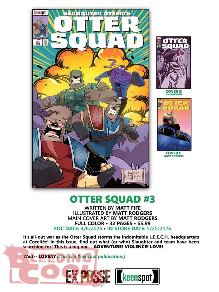 (Slaughter Otter can also be seen in Free Comic Book Day special Keenspot Toybox in May!) From out of the shadows, the true leader of L.E.E.C.H. emerges! Bringing a cold and calculated brand of anger and vengeance, both Slaughter and the Leech Queen will beg for death to escape the clutches of *SPOILER*! Don't miss this issue! $5.99 5/28/2025