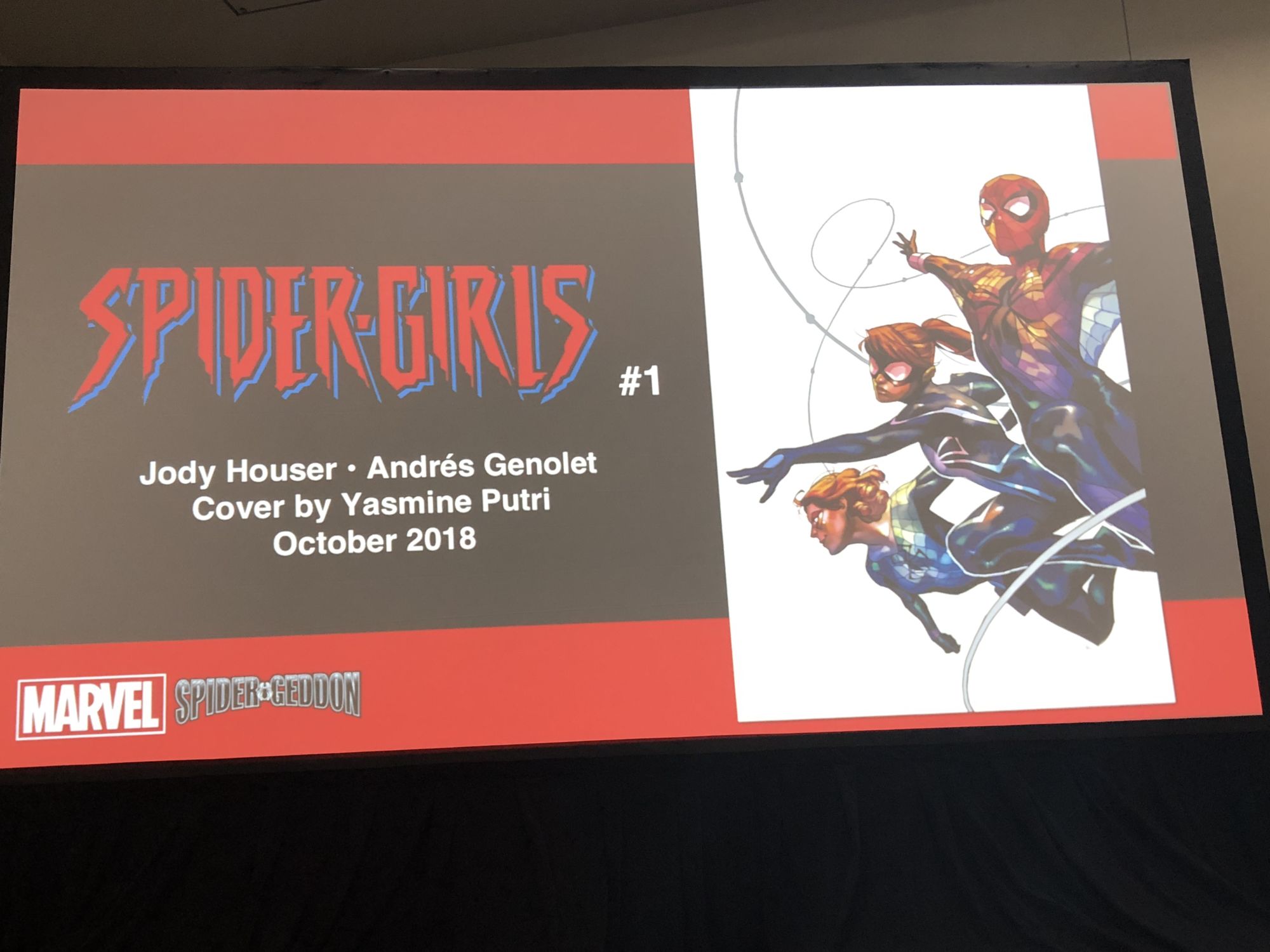 During their presentation at the Diamond Retailer Summit on at San Diego Comic-Con, Marvel highlighted three new Spider-books for October. First up, Spider-Girls, by Jody Houser and Andres Genolet. That's right — Mayday Parker is back, alongside Anya Corazon and Spiderling.
