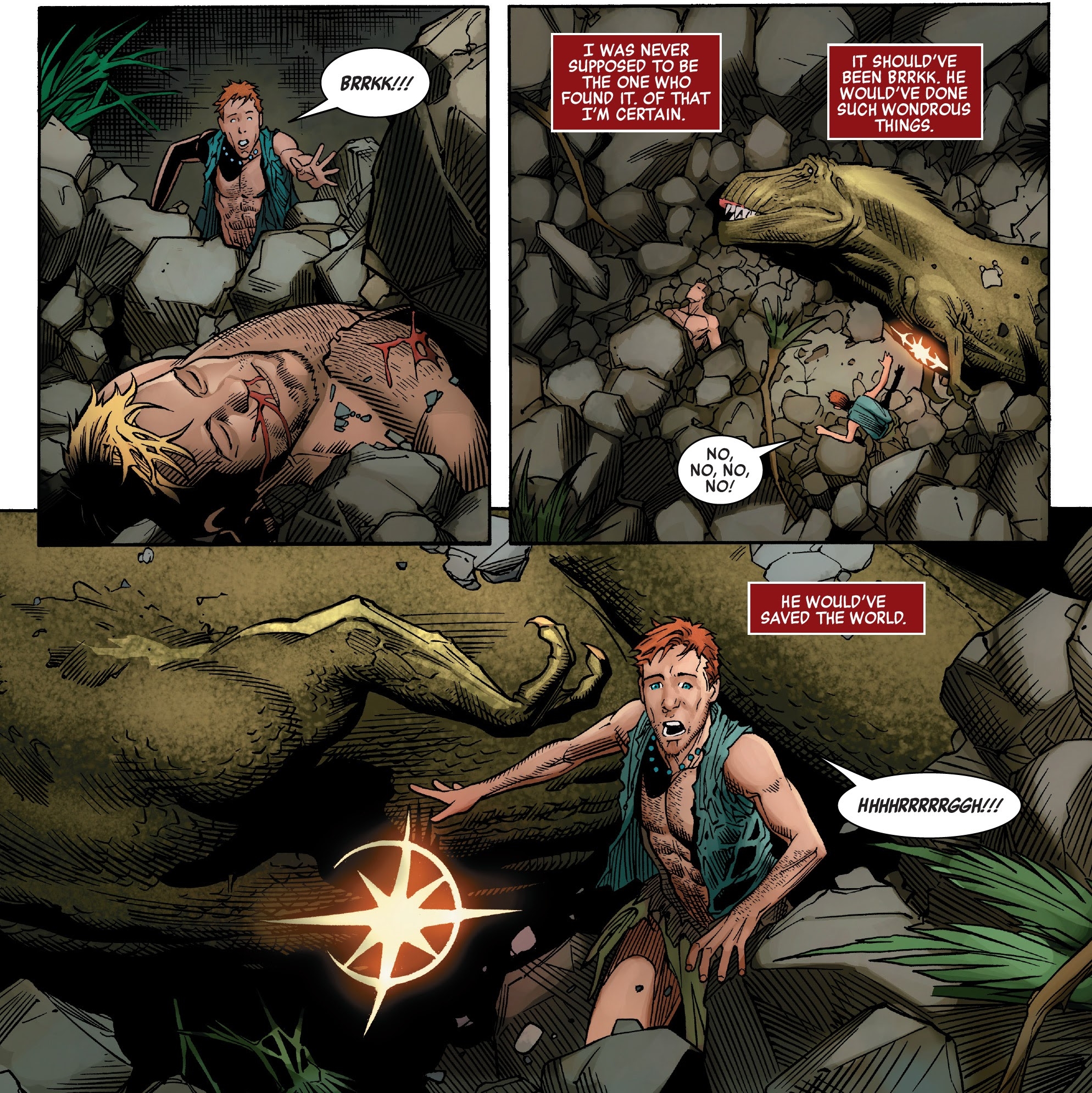 In last week's Avengers #26, set in the dawn of man, as part of the Avengers 1,000,000 BC storylines, we got to meet the first superhero of Earth, sixty-six million years ago, as a result of the asteroid that hit Earth and wiped out the dinosaurs. Well, almost all the dinosaurs. Because one got lucky and, courtesy of the same asteroid, became the first superhero of the Marvel Universe, a Tyrannosaurus Rex, the first wielder of the Star Brand in the Marvel Earth. And who seemed to use the Star Brand's power to live for sixty-five million years – or at least somehow had progeny that he/she could pass the Star Brand along, long after dinosaurs died out.