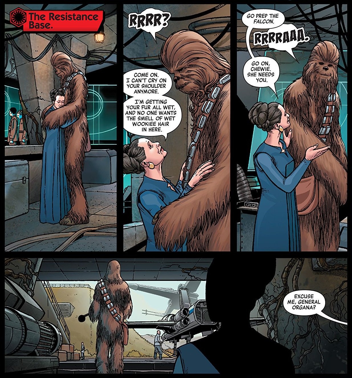 In Star Wars: Age of Resistance: Rey #1, in stores today from Marvel Comics from Australia's Favorite Son Tom Taylor and artist Ramon Rosanos, Leia and Chewie did share a moment together, and a hug, after Han's death. And since Marvel's Star Wars comics are canon, that means the hug is official. Taylor boasted of his accomplishment on Twitter: