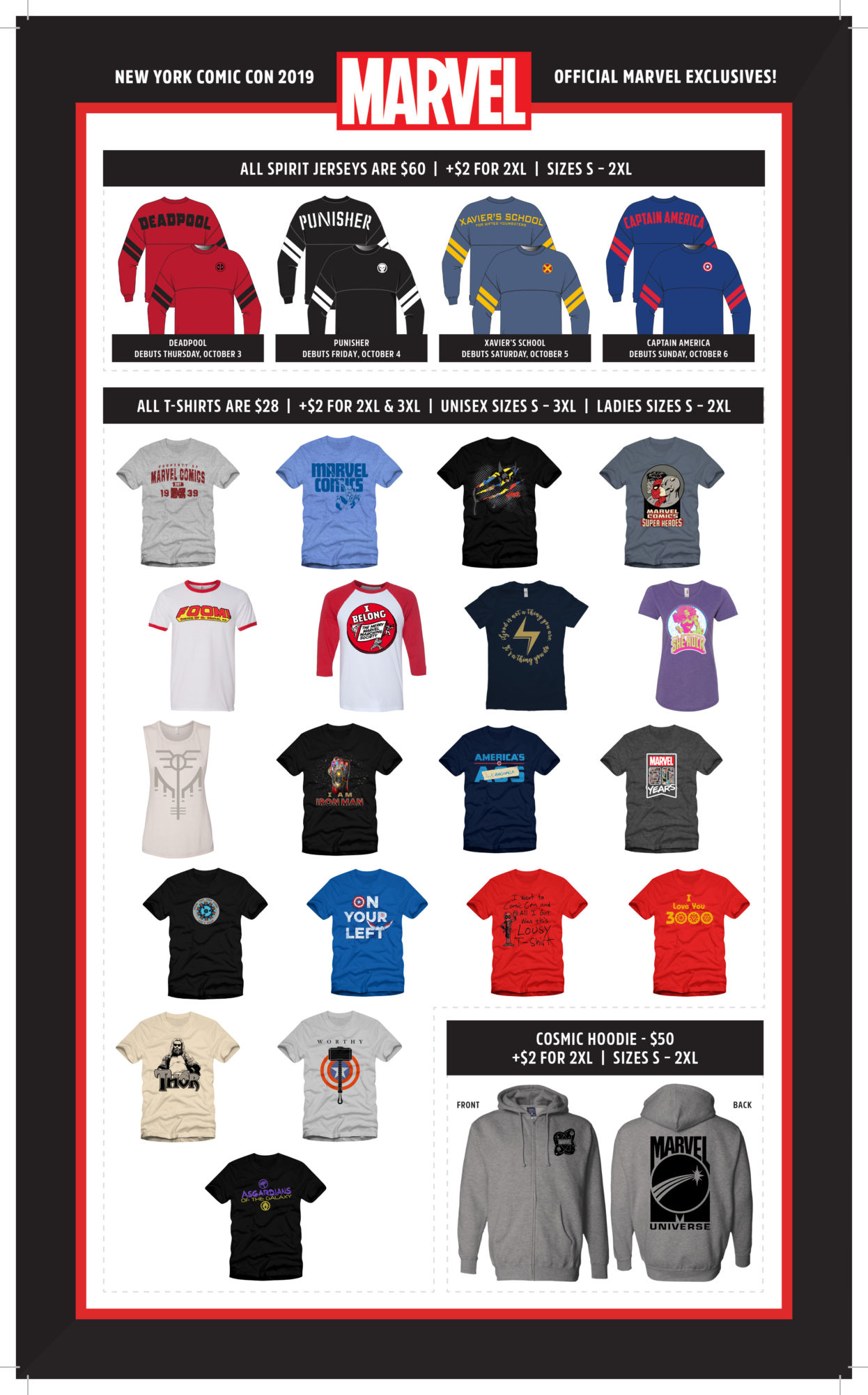 Back by popular demand, Marvel will offer never-before-seen Marvel Spirit Jerseys exclusive to each day of the show, featuring Deadpool on Thursday; The Punisher on Friday; Xavier's School on Saturday; and Captain America on Sunday. These limited-time jerseys will only be sold during their respective days of the show, so be sure to plan accordingly! Marvel's convention-exclusive t-shirts will be available all days of the show, while supplies last.