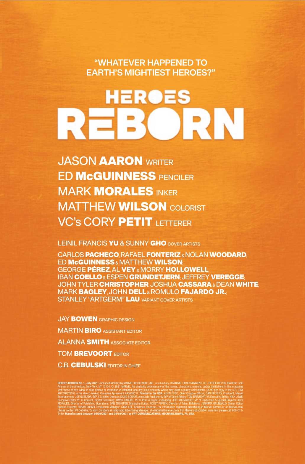 - Interior preview page from MAR210497 HEROES REBORN #1 (OF 7), by (W) Jason Aaron (A) Ed McGuinness (CA) Leinil Francis Yu, in stores Wednesday, May 5, 2021 from MARVEL COMICS