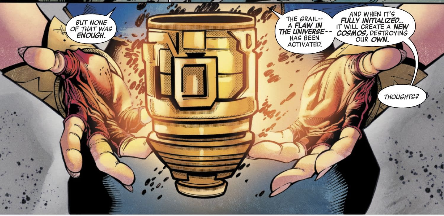 Reed Richards inadvertently created the Grail, a flaw in the universe that would birth the next version of itself, at the end of Secret Wars, helping to create the Eighth version of reality, with Franklin Richards and Molecule Man. Well there's only one place that will do to keep it. Even if they had to trick the Ashen folk in question to take it there…