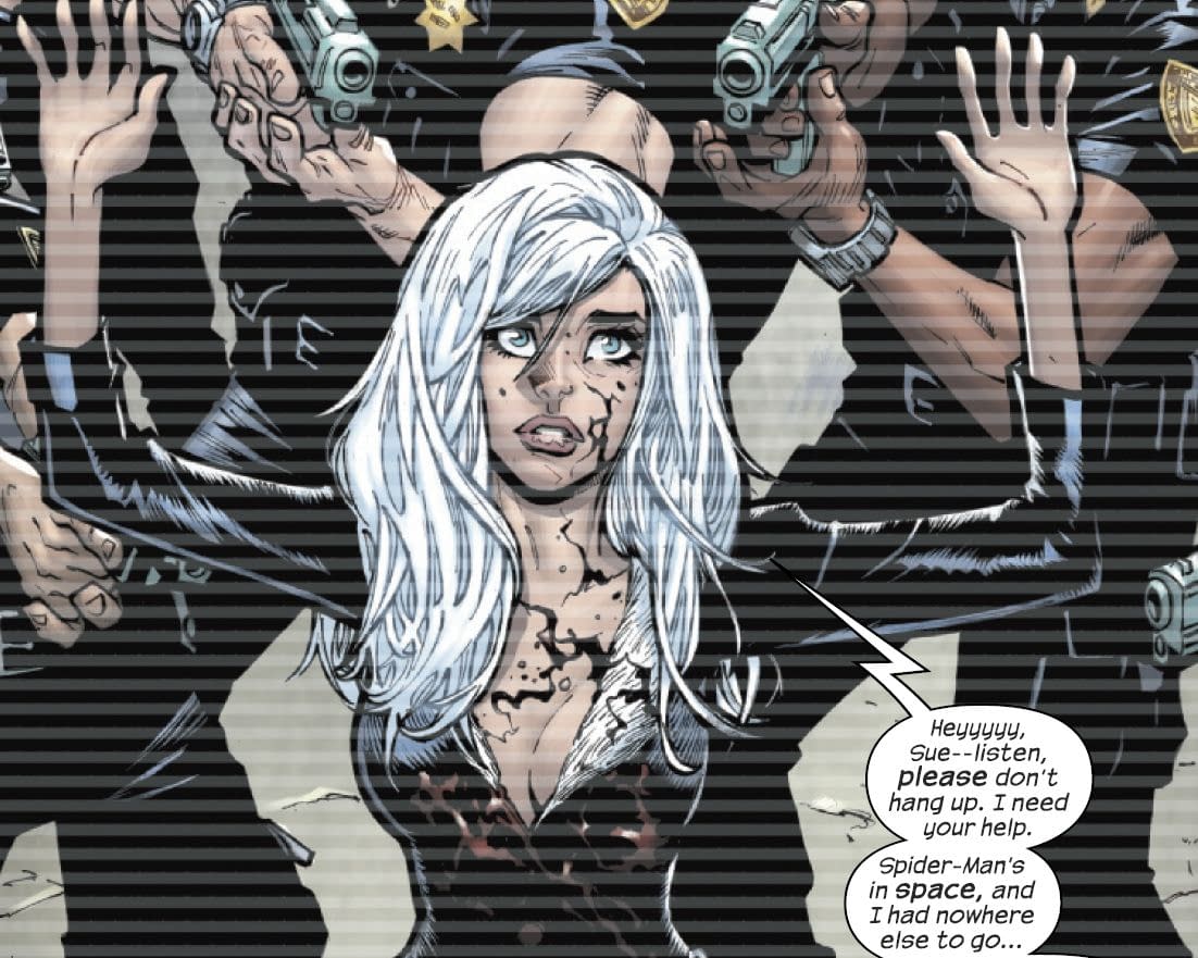 - Felicia Hardy seeks the Invisible Woman's help after being accused of murder, with Spider-Man missing.
