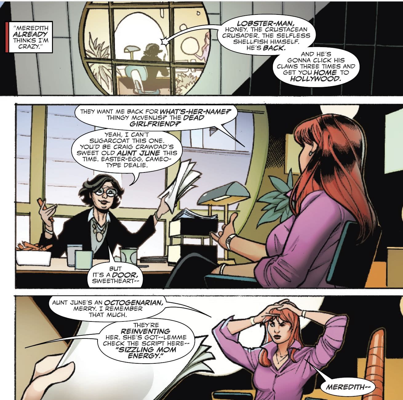 Mary Jane Watson is a model and an actress, although as the current host of Venom and, before that, a full-time mother, she hasn't done much of either for a while. In today's Venom #250, she tries to get that back on course, but it seems that the parts she used to play aren't that available to her anymore. Twenty-three years ago, in publication time at least, she played the love interest in the Lobster-Man film, as seen in Amazing Spider-Man #43 by J. Michael Straczynski and John Romita Jr, from 2002.