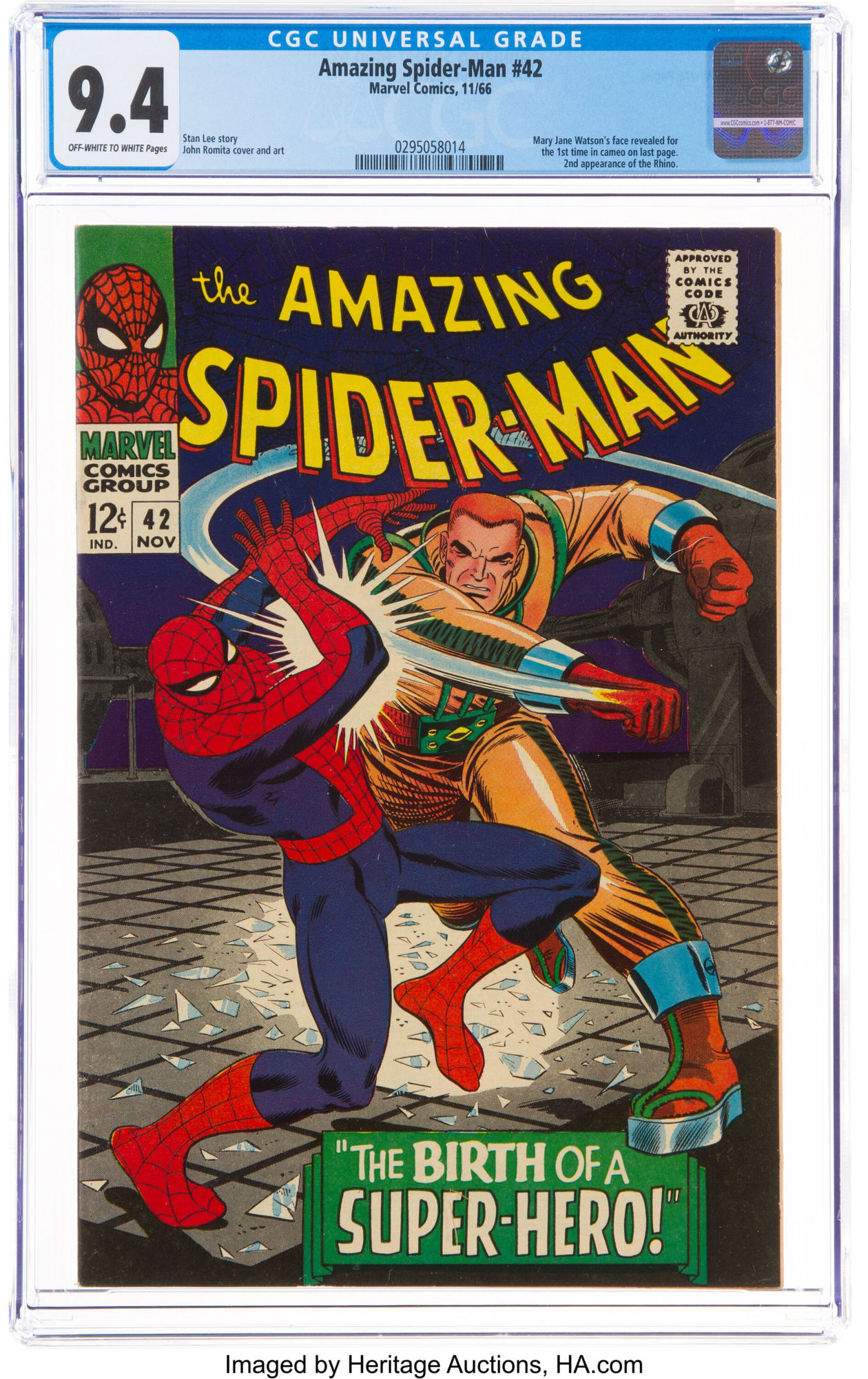 The Amazing Spider-Man #42 (Marvel, 1966) CGC NM 9.4 Off-white to white pages. Mary Jane Watson's face shown for first time in cameo appearance on last page. Second appearance of Rhino. Foggy Nelson cameo. John Romita Sr. cover and art. Overstreet 2020 NM- 9.2 value = $575. CGC census 7/21: 71 in 9.4, 43 higher.