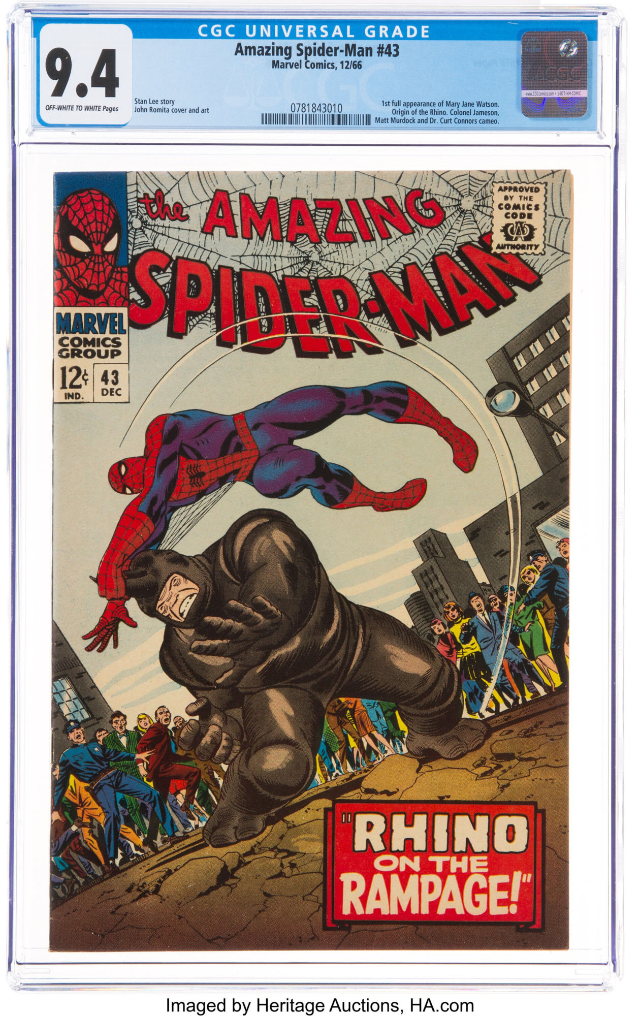 The Amazing Spider-Man #43 (Marvel, 1966) CGC NM 9.4 Off-white to white pages. First full appearance of Mary Jane Watson. Origin of the Rhino. John Romita Sr. cover and art. Overstreet 2020 NM- 9.2 value = $425. CGC census 7/21: 66 in 9.4, 34 higher.