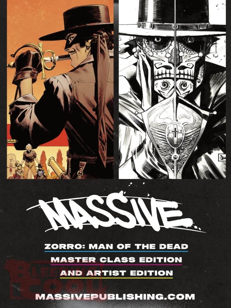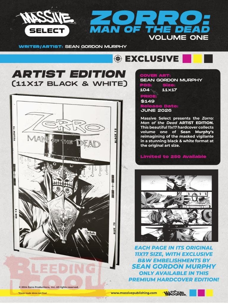 Massive Publishing doesn't just sub-distribute other people's comic books; they also publish their own. Every now and then. And in Massive Publishing's June 2026 solicits and solicitations, that includes Sean Gordon Murphy's Zorro: Man Of The Dead as part of their Massive Select line in two very different versions. A Master Class edition of the series, with nearly a hundred pages of extra details that was previously only issued through Kickstarter, with tutorials and page breakdowns, is now available to comic book stores, at 7×11 size. And an Artist Edition version, the original black and white artwork published at the original size of the artboards, 11×14. Both $150, both out on the 17th of June…