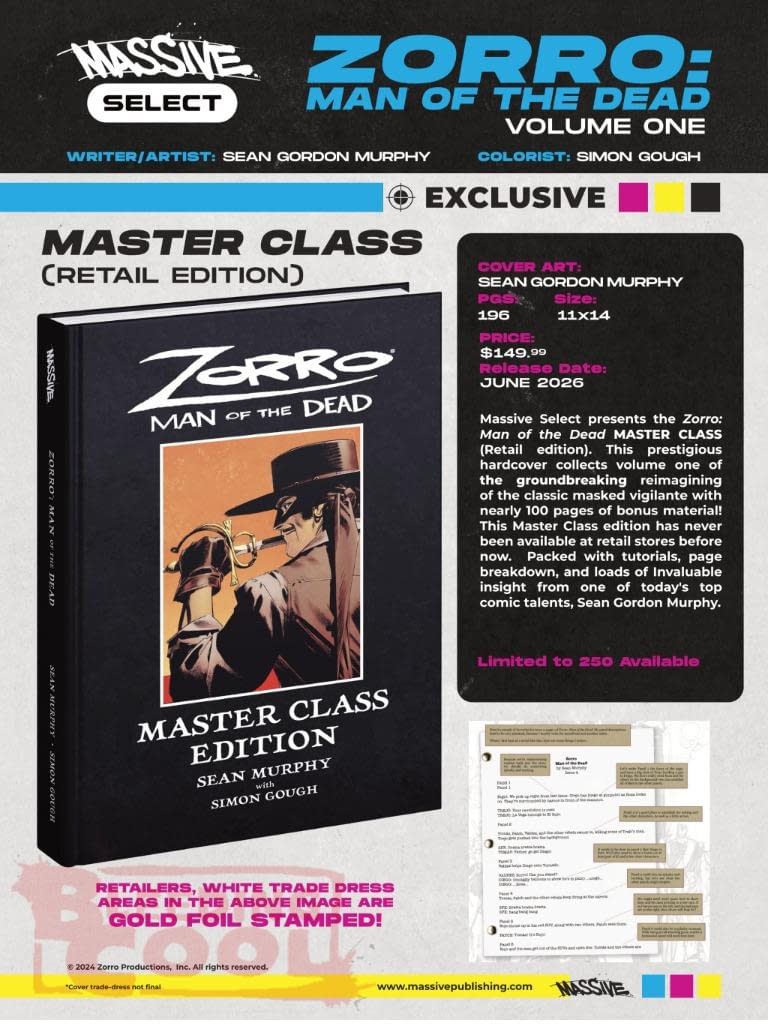 Massive Select presents the Zorro: Man of the Dead MASTER CLASS (Retail edition). This prestigious 11×14 hardcover collects volume one of Sean Murphy's reimagining of the masked vigilante with nearly 100 pages of bonus material. This retail edition of the sold out Kickstarter Exclusive Master Class edition is packed with tutorials, page breakdown, and loads of insight from one of comic's top talents, Sean Murphy. Available for the first time ever. $149.99 6/17/2026