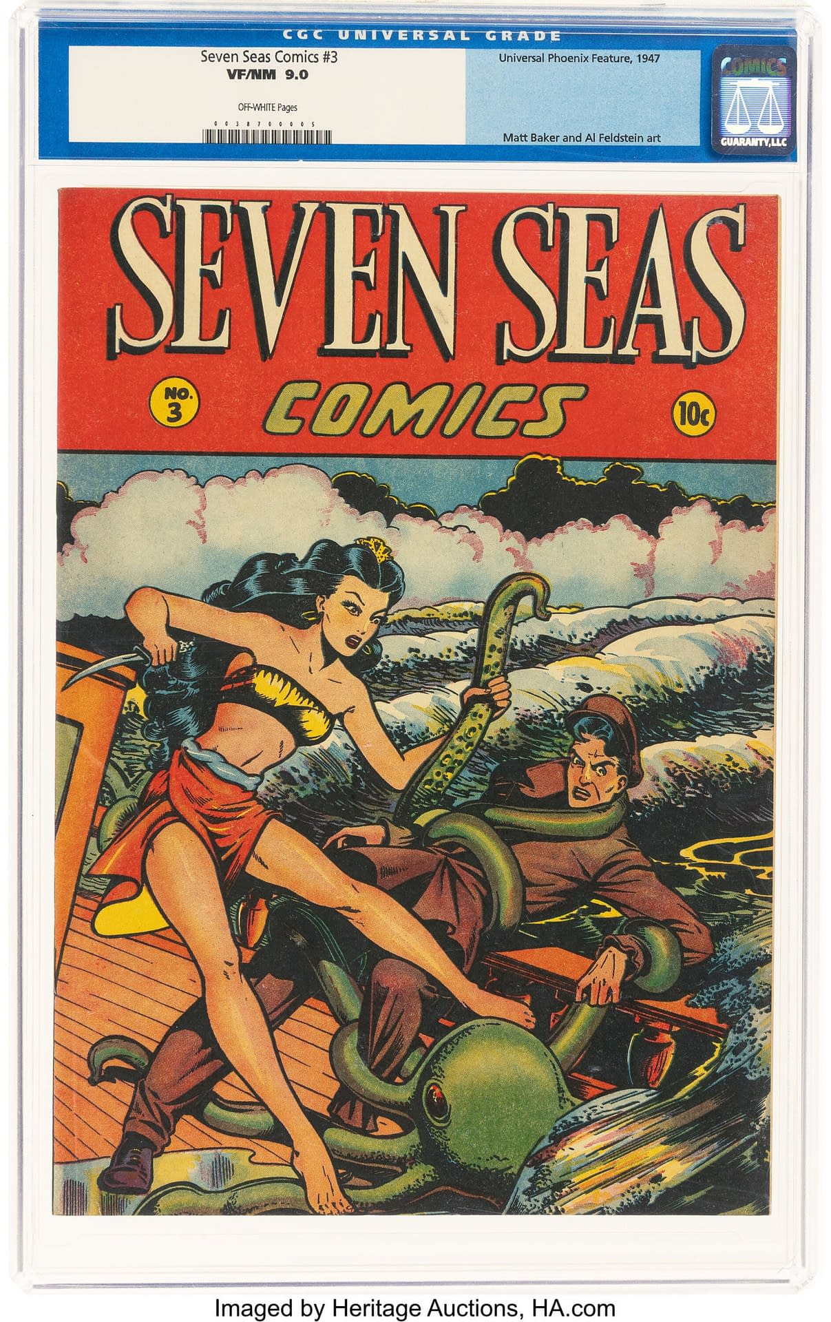 An artist who became legendary for his cover artwork in particular, Matt Baker had only done six of them before his first South Sea Girl cover, on Seven Seas Comics #3. What's more, this piece is his first true Good Girl cover, on a series that very likely helped raise his profile in the comic book industry substantially, leading to his work for Fox Feature Syndicate and beyond. A key moment in Matt Baker's career, there's a high grade CGC VF/NM 9.0 Off-white pages copy of Seven Seas Comics #3 (Universal Phoenix Feature, 1947) up for auction in the 2025 October 16 Golden Age Comics Century Showcase Auction III at Heritage Auctions.