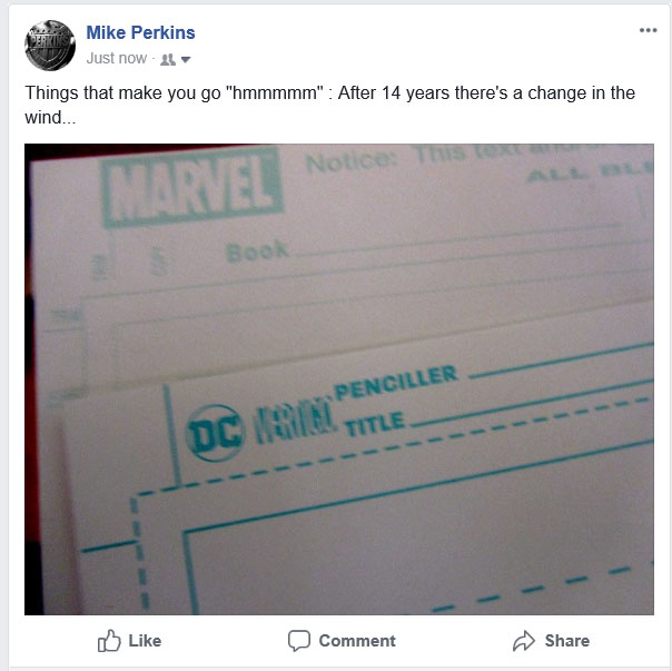 But it looks like it will be Burbank editorial he will be reporting to, moving on. As Mike Perkins seems to suggest he is moving to DC Comics…. with a peek at his latest blank art board.