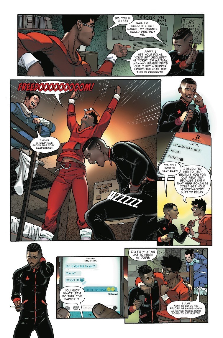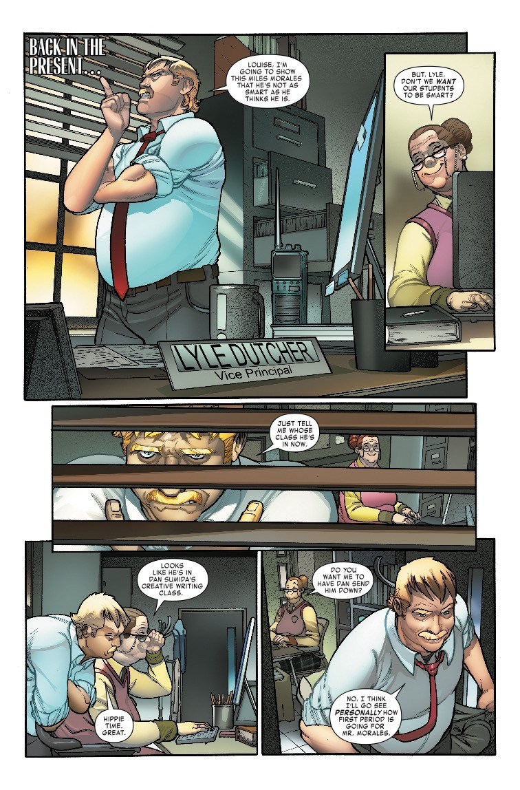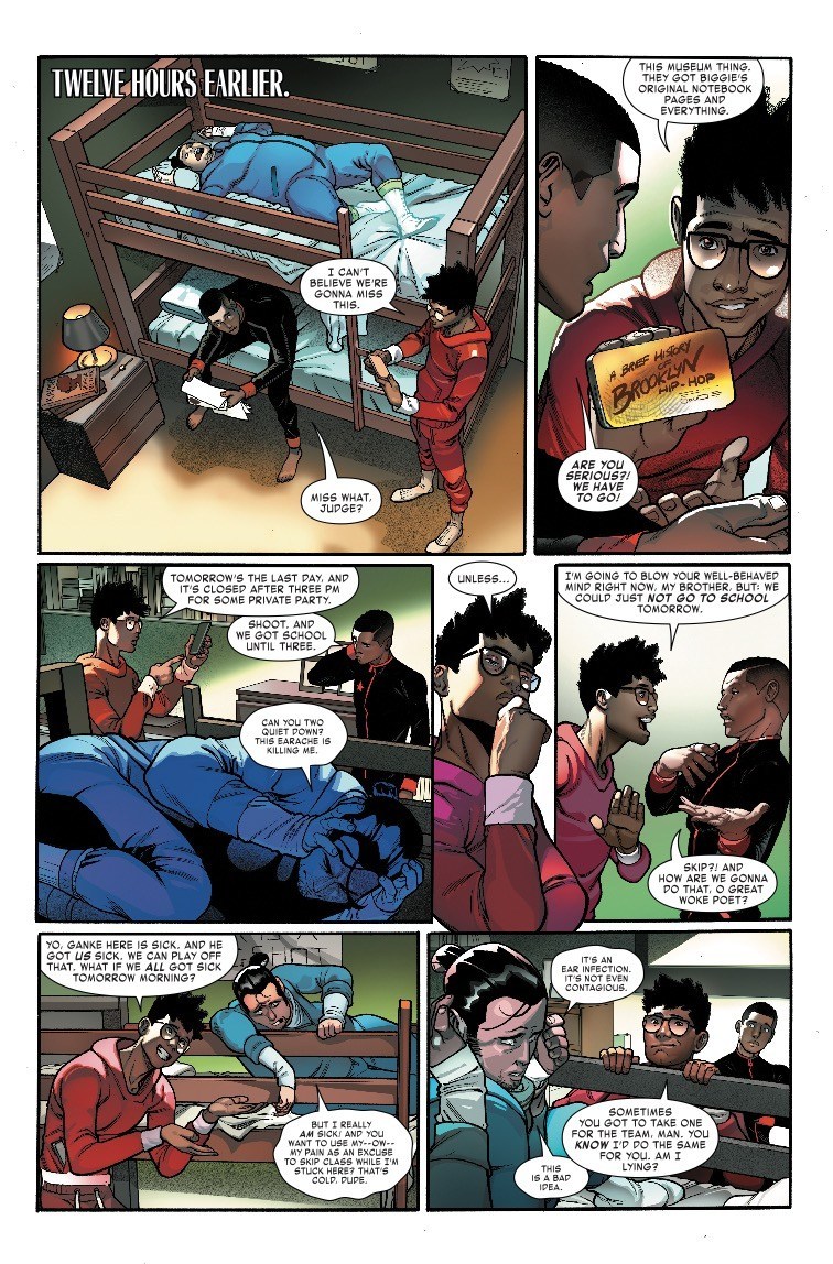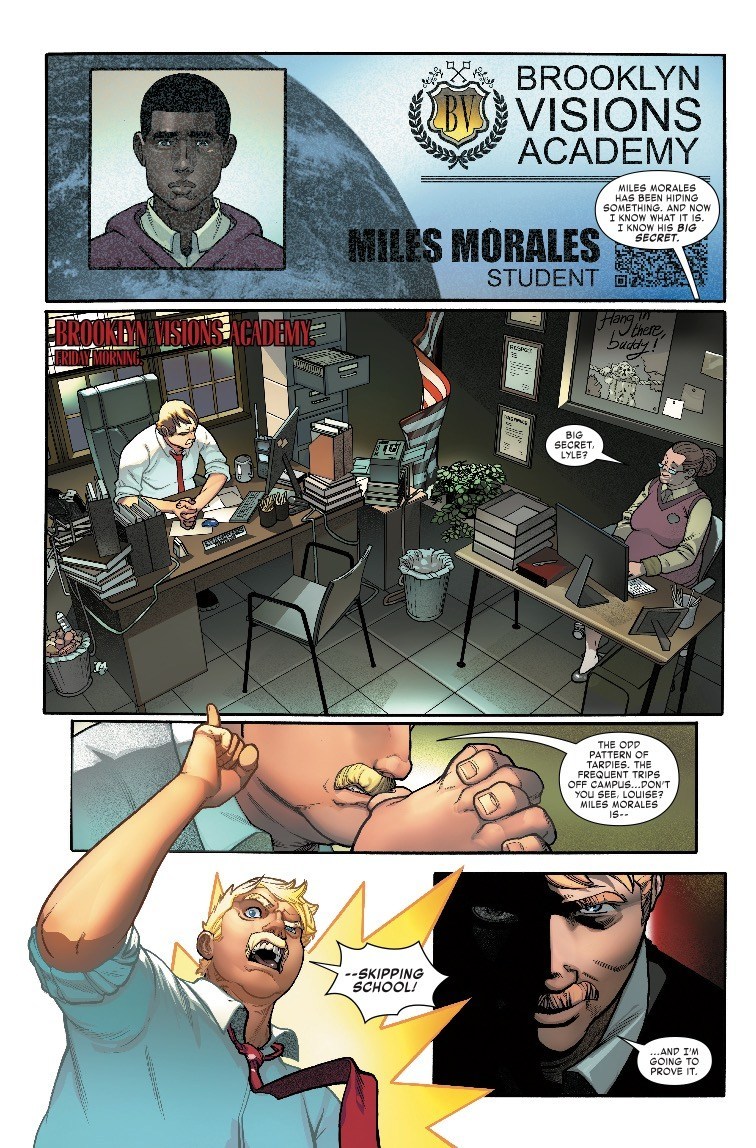 It seems like lots of Spider-people have been forgetting the most important lesson of being a Spider-person lately. Yes, with great power, there must also come great responsibility. But lately, Peter Parker has forgotten it. Gwen Stacy has forgotten it. And in next week's Miles Morales: Spider-Man #4, Miles Morales has forgotten about responsibility too. In particular, his responsibility to… go to school?!