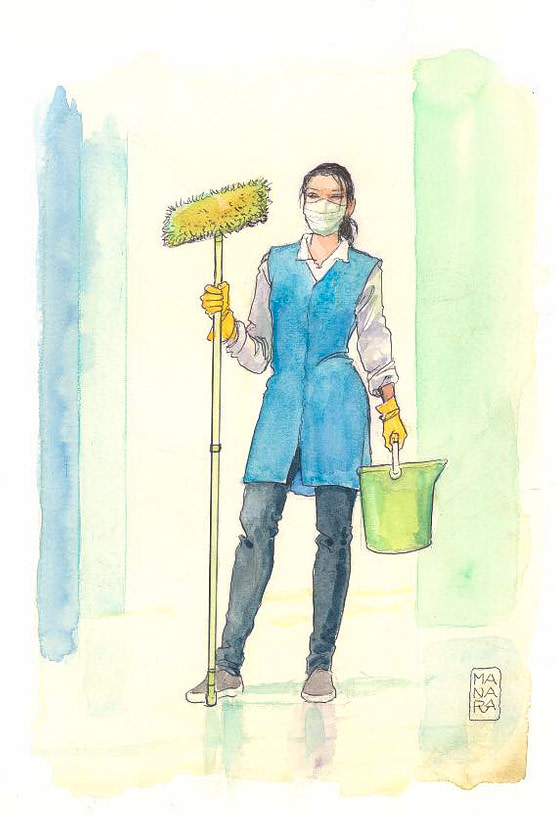 I wondered how I could have been vaguely useful, as a draftsman, and how I could express gratitude and encouragement. After more than fifty years spent celebrating the beauty and seduction of women, it was quite natural to also celebrate their other virtues. Besides the health workers there were many other people who continued to do their job, in the interest of all, exposing themselves to the danger of contagion: cashier of supermarkets, cleaners in hospitals and outside, the police… I drew one by one, simply to thank them and, perhaps, even a little hoping that we will remember them when everything is over."