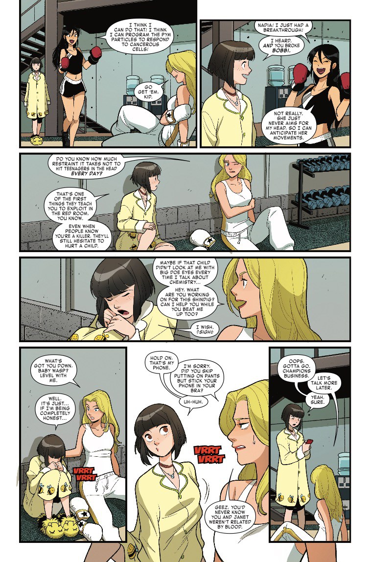 In the high-stakes world of WWE, it's traditional that your top babyfaces never tap out. And since Marvel is the company WWE aspires to be, we have to assume the rules are the same, and therefore mockingbird is either a heel or a midcarder, because she gets totally owned by teenage scientist Ying in this preview of next week's Unstoppable Wasp #2.